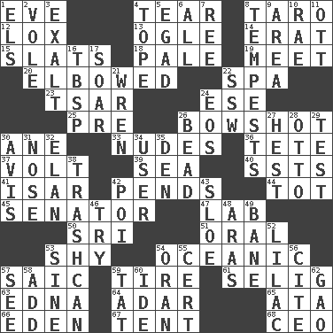 ACROSS 1. Night before a holiday 4. Pull apart 8. Pacific island yam 12. Brine-cured salmon 13. Stare 14. Part of Q.E.F. 15. Narrow boards 18. Diluted with white 19. Confront 20. Shoved, as through a crowd 22. Health resort 23. Russian ruler of old 24. Compass dir. 25. Before (prefix) 26. The distance a bow sends an arrow 30. One (Scot) 33. Unclothed pictures 36. False hair 37. Electrical Unit 39. Ocean 40. Fast planes 41. Austrian river, tributary to the Danube 42. Depends 44. Small child 45. Legislator 47. Experiment locale 50. Indian title of respect (Mr.) 51. Taken by mouth 53. Like a shrinking violet 54. Pertaining to the sea 57. Ketch in the Levant 59. Become fatigued 61. Former Milwaukee Brewers owner Bud 63. Pulitzer Prize-winning author Ferber 64. The sixth month of the Jewish calendar 65. "One Day ___ Time" 66. Genesis locale 67. Portable shelter 68. Corporate head (abbr.) DOWN 1. Raised railways 2. Grand slam 3. Glorify 4. Drink excessively 5. Mild oath 6. Everything 7. To separate or throw off 8. Storms 9. Length times width 10. Actress Charlotte 11. Baseball player Mel 16. Cook's measure (abbr.) 17. Fly high 21. Songbird 22. Compass dir. 24. Greek goddess of the dawn 26. Necklace unit 27. Behest 28. "Beetle Bailey" pooch 29. Trial 30. Advice 31. Olfactory organ 32. Flair 34. One who uses or employs something 35. Lair 38. File 13 42. Luau course 43. A type of plum 46. Attempt to accomplish something 48. Ancient river in northeast Turkey 49. Object of repulsion 52. Pale purple color 53. Trig term 54. NW Algerian seaport 55. Certainty 56. Quote 57. Observe 58. Say or write further 59. Make lace 60. Binary compound 62. E Mali city