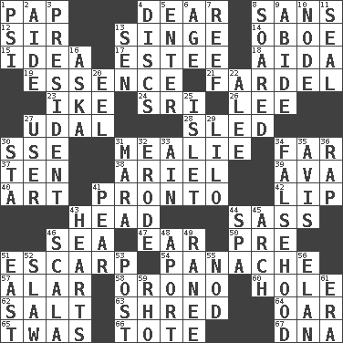 ACROSS 1. Infant food 4. Letter starter 8. Without 12. Title for a knight 13. Burn superficially 14. Mitch Miller's instrument 15. It may be bright or harebrained 17. First name in cosmetics 18. Opera by Verdi 19. Center 21. Pack 23. Eisenhower's nickname 24. _ Lanka 26. Area sheltered from the wind 27. Allodial 28. Downhill vehicle 30. Compass dir. 31. Ear of corn 34. Distant 37. Nine, plus one 38. Satellite of Uranus 39. Actress Gardner 40. Tate display 41. Right away 42. Mouth edge 43. Froth on beer 44. Backtalk 46. Ocean 47. Ewer handle 50. Before (prefix) 51. Fortification 54. Flamboyance 57. Having or resembling wings 58. U. of Maine site 60. Hollow 62. Table seasoning 63. Tear up 64. Rowing implement 65. It was, poetically 66. Carry 67. Heredity factor (abbr.) DOWN 1. 23rd letter of the Greek alphabet 2. Assistant 3. Elected leader of a country 4. Flat circles 5. Keyboard key 6. Grow older 7. Coral collection 8. Flew 9. Remain 10. Connecting point 11. Lick closed 13. Elected rep. 16. "____ silly question..." 20. Snakelike fish 22. Toward shelter 25. Small island 27. One who uses or employs something 29. _ and Stitch 30. R.R. building 31. Hindu Mythology: god of death 32. Wear away 33. The 18th letter of the Arabic alphabet 34. It jiggles the polygraph 35. Opinion 36. Hit sharply and swiftly 41. Lightbulb-shaped fruit 43. Centers of feelings and intuitions 44. Health resort 45. Bowlike part 46. Any of the three canals of the cochlea 48. To the left, to Queeg 49. The wife of a rajah (variant) 51. Compass direction 52. Cole _ (cabbage dish) 53. Mail 55. Allow head to fall sleepily 56. Liveliness 59. 17th letter of the Greek alphabet 61. Epoch