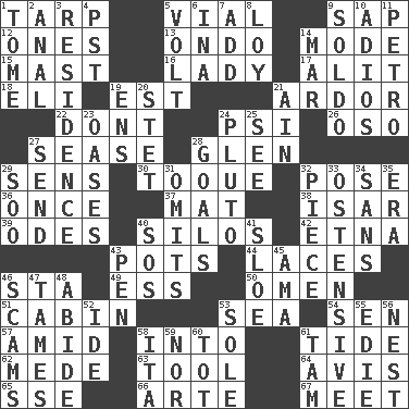 ACROSS 1. Canvas cover 5. Small bottle 9. Plant excrement 12. Singles 13. Southwest Nigerian state 14. Method 15. Vertical spar for supporting sails 16. Kenny Rogers chart-topper in '80 17. Came down and settled, as after flight 18. Biblical high priest 19. Eastern Standard Time (abbr.) 21. Zeal 22. Do not 24. Air pressure measure (abbr.) 26. Bear (Spanish) 27. Gospel singer Marvin 28. Small, secluded valley 29. Elected reps. 30. Woman's close-fitting hat 32. Airs 36. At one time in the past 37. Floor protector 38. Austrian river, tributary to the Danube 39. Lyric poems 40. Grain storage towers 42. Inactive volcano in Sicily 43. Cooking vessels 44. Shoestrings 46. R.R. building 49. Double-curved letter 50. Presage 51. Apartment or room in a ship 53. Ocean 54. Elected rep. 57. Among 58. To the inside or interior of 61. Event that recurs at intervals 62. Ancient Persian 63. Instrument 64. Advice 65. Compass dir. 66. Johnson of "Laugh-In" 67. Rendezvous DOWN 1. Heavy book 2. Of or related to the anus 3. Dwelling 4. Pacific Standard Time (abbr.) 5. Electrical Unit 6. _ tizzy (2 wds.) 7. Say or write further 8. Myrna of the movies 9. Twentieth part of a lira 10. Goodbye (Sp.) 11. Stone: prefix 14. Third mo. 19. Followers of ems 20. Proofreading order 21. The 18th letter of the Arabic alphabet 23. Fertile tracts in a desert 24. Mickey's pet 25. Perceive with the eye 27. Transmit 28. Purposes of endeavors 29. "Barney Miller" actor Jack 31. Leaves out 32. Component 33. Clearly or manifestly demonstrative 34. Without 35. Period 40. Mayday 41. A type of plum 43. Fenced enclosure 45. Nursemaid (var.) 46. Fraudulent business schemes 47. Corrects by punishment or discipline 48. Stay 52. Binary compound 53. Not divided or shared with others 55. Singer Brickell 56. A home for chicks 58. Call ___ day 59. Not either 60. Small child 61. Scottish cap