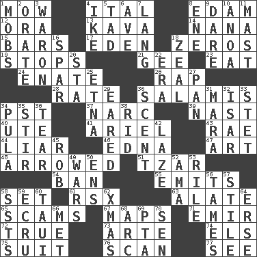 ACROSS 1. Cut the grass 4. Slanted text style (abbr.) 8. Dutch treat 12. Mouth or opening 13. Polynesian shrub of the pepper family 14. Grandmother 15. Soap units 17. Paradise 18. Nothings 19. Constricts 21. Unit of force equal to gravity 23. Erode 24. Maternal 26. Reproach for some lapse or misdeed 28. Pace 30. Deli grouping 34. Pacific Standard Time (abbr.) 37. Drug cop 39. Political cartoonist Thomas 40. Shoshoni 41. Satellite of Uranus 43. Actress Charlotte 44. One who doesn't tell the truth 46. Pulitzer Prize-winning author Ferber 47. Tate display 48. Moved like an arrow 51. Russian ruler 54. Bar 55. Sends forth 58. Put into a specified state 61. Acura sports coupe 63. Having winglike extensions 65. Fraudulent business schemes 67. Atlas contents 71. Independent ruler or chieftain 72. Loyal 73. Johnson of "Laugh-In" 74. Raised railways 75. Costume for a special activity 76. Skim 77. Observe DOWN 1. Disorderly crowds 2. Speak pompously 3. Make _____ (do battle with) 4. Mamie's husband 5. Bit 6. "___ Maria" 7. Austrian-born American filmmaker Fritz 8. Compass dir. 9. Have the gumption 10. Small Philippine buffalo 11. Vertical spar for supporting sails 16. Practice fight 18. Ardor 20. R.R. building 22. Period 25. Inactive volcano in Sicily 27. Baking dish 29. Having ears or earlike features 30. Aroma 31. Hindu Mythology: god of death 32. Austrian river, tributary to the Danube 33. Proofreading order 34. Monetary unit of Botswana 35. Use a swizzle stick 36. Pull apart 38. To free from 42. Goldbrick 45. Director Reiner 49. Armed conflicts 50. Followers of ems 52. Nanny (var.) 53. Cause heat under the collar 56. Corrects by punishment or discipline 57. Vertical member of a panel or frame 58. Fast planes 59. Shade of tan 60. "Change" in Tahitian 62. Dec. holiday 64. Celtic language 66. Was introduced to 68. Curve 69. Parent Teacher Association (abbr.) 70. Elected rep.