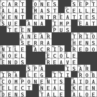 ACROSS 1. Draw slowly or heavily 5. Singles 9. Back-to-school mo. 13. Jai ____ 14. Vertical spar for supporting sails 15. Cell (Danish) 16. Gone 17. Pleas 19. Take to court 20. Santa ___, CA 21. Naughty child 22. Erode 23. Adolescent 25. Festering 26. Approach 30. Musical group of three 34. Father Junipero _ 35. Coop moms 36. Mediterranean tributary 39. Bitter 42. Redecorate 43. Christmas carol 44. Learning spot: Fr. 46. Conclusions 47. Break or tear apart 48. Health resort 51. Austrian river, tributary to the Danube 54. Lyricist Gershwin 57. Part of a journey 58. One more than two 60. Director Reiner 62. Parts 65. Opera by Verdi 66. Choose 67. Be tempered by heat 68. Peachy ____! 69. Hiding places for outlaws 70. Story 71. _ vera DOWN 1. Crow sounds 2. Eskimo relative 3. Indian princess (variant) 4. Teat (slang) 5. Presage 6. Grandmother 7. Eastern Standard Time (abbr.) 8. Long narrow piece of something 9. Put into a specified state 10. Writer Wiesel 11. Entreaty 12. Trial 15. Smile enhancers 18. Australian flightless bird 20. Singer Murray 24. Artist's stands 27. Period 28. Curve 29. More valued for its uncommonness 30. Threesomes 31. To separate or throw off 32. Indiana (abbr.) 33. Bear (Spanish) 36. Compass dir. 37. Electrically charged atom 38. Directed 40. Frozen water 41. ___ good deed 45. 57 in ancient Rome 48. Narrow, elongated depression 49. Fenced enclosure 50. Representative 52. Satellite of Uranus 53. Cowboy competition 54. On the rocks 55. Hero or heavy, e.g. 56. So be it 58. Slanted text style (abbr.) 59. Capri or Wight 61. Object of repulsion 63. Personal Computers (abbr.) 64. Teachers' org. 65. Alias (abbr.)