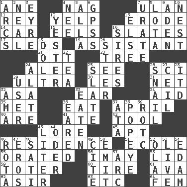 ACROSS 1. A saturated hydrocarbon 4. Tired old horse 7. ____ Bator 11. Marina Del _, California 12. Sharp bark 13. Wear away 14. Automobile 15. Snakelike fish 16. Chalkboards 17. Bobsleighs 19. Aide 21. Baseball player Mel 23. Relationship diagram 24. Toward shelter 25. Observe 26. _-fi 29. Extreme 30. French article 31. Fish or hair follower 32. White ___ sheet 33. Ewer handle 34. Assist 35. Was introduced to 36. Erode 37. Showery time 40. "We ___ not amused" (Victoria) 41. Had dinner 42. Instrument 43. Old wives' tales, e.g. 45. Fitting 46. Home 51. Learning spot: Fr. 55. Spoke pompously 56. "If ____ say so..." 58. Hat (slang) 59. Carrier 60. Hoop that covers a wheel 61. Actress Gardner 62. SW Saudi Arabia district 63. And so on (abbr.) 64. Opposite of masc. DOWN 1. Arches 2. Actress Patricia 3. Jane of fiction 4. Born 5. Silent film actress Nazimova 6. Global Positioning Systems (abbr.) 7. A salt of uric acid 8. Globular water bottle used in Asia 9. Arabian gulf 10. A home for chicks 12. Next before 13. Otherwise 16. Titles for men of rank and authority 18. Dunce 20. Bull 22. Afternoon social gathering 24. Having winglike extensions 25. Chalkboard 26. Slow-paced one 27. To provide with a ceiling 28. It would 29. One who uses or employs something 32. Nanny (var.) 33. Eroded 36. Having ears or earlike features 37. "One Day ___ Time" 38. Wimpy's pal 39. College mil. group 43. 61 cubic inches 44. Baltic tributary 46. Round or rotation of duties 47. Greek god of love 48. Suttee (variant) 49. Quote 50. Give off 52. Norwegian king 53. Not recorded 54. Dutch treat 57. Curve