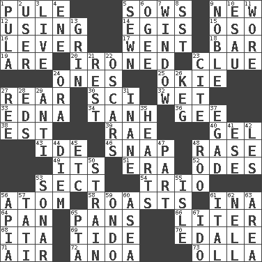 ACROSS 1. Whimper 5. Sty mamas 9. ___ Haven, CT 12. Putting into practice 14. Armor plate that protects the chest 15. Bear (Spanish) 16. Prying instrument 17. Left 18. Tavern 19. "We ___ not amused" (Victoria) 20. Pressed 23. A slight indication 24. Washington bills 25. Migrant worker of the '30s 27. Tail end 30. _-fi 32. Dripping 33. Pulitzer Prize-winning author Ferber 34. Hyperbolic tangent 36. Turn to the right 38. Eastern Standard Time (abbr.) 39. Actress Charlotte 40. Set 43. Binary compound 46. Fastener 48. Raze (variant) 49. ___ a Wonderful Life 51. Period 52. Lyric poems 53. Religious group 54. Musical group of three 56. Smallest unit of an element 58. Exposes to great heat 61. _ tizzy (2 wds.) 64. Baking dish 65. Zero-star reviews 66. 61 cubic inches 68. Call ___ day 69. Periodic rise and fall of the sea level 70. Peak District village in England 71. Atmosphere 72. Small Philippine buffalo 73. Rounded earthenware pot or jar DOWN 1. Monetary unit of Botswana 2. One who uses or employs something 3. Not recorded 4. Compass dir. 5. Stitched 6. Double curve, resembling the letter S 7. Light entry point 8. Fast jet (abbr.) 9. Having high moral qualities 10. Son of Isaac 11. Had on 13. Amused look 21. Relief 22. Motion picture awards 23. Quote 24. Mouth or opening 26. Barrel 27. Portuguese money of account (variant) 28. Begley and Asner 29. Opposed to 31. Empty; void 35. Centers of feelings and intuitions 37. Mild oath 41. Compass dir. 42. French article 44. South Vietnam president (1954) 45. And so on (abbr.) 47. Component 48. Friend of Pooh 50. Put through a sieve 53. Underwater navigation system 55. Small island 56. Capital of Western Samoa 57. Jacques of French films 59. Southwest Nigerian state 60. Toward the sea 61. Slanted text style (abbr.) 62. 1994 drama film starring Jodie Foster 63. Length times width 65. Parent Teacher Association (abbr.) 67. Wedding promise