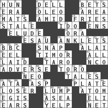 ACROSS 1. Attila the _ 4. Small valley 8. Wagers 12. Period 13. Margarine 14. Type of rug 15. Floor protectors 17. Among 18. Strips of potato fried in deep fat 19. Showing deterioration from age 21. Wedding promise 23. Followers of ems 24. Dodge 26. Mouth or opening 28. Son of Isaac 30. Short socks 34. English channel? 37. Fastener 39. Mountain range southwest of Kyrgyzstan 40. Snakelike fish 41. The easternmost of the Lesser Sundas 43. Everything 44. Put down 46. Pacific island yam 47. Non-commissioned officer (abbr.) 48. Contrary to your interests or welfare 51. "Corrida" creature 54. Modern: prefix 55. Stories 58. _ moment's notice (2 wds.) 61. Viper 63. Food holder 65. Failure 67. Mass 71. Smallest unit of an element 72. The front part of a cuirass 73. Toward the sea 74. Biblical high priest 75. Hearing organs 76. Sharp bark 77. Fish or hair follower DOWN 1. Folds over and sews together 2. A salt of uric acid 3. Brizilian seaport 4. ___ good deed 5. Shade tree 6. Flowery wreath 7. Farming town in central California 8. Soap unit 9. 4th largest of the Great Lakes 10. Adolescent 11. Backtalk 16. Turn sharply 18. Tined utensil 20. Begley and Asner 22. Spanish title 25. Compass direction 27. Insect wing 29. Join together 30. To the left, to Queeg 31. Liveliness 32. Baby powder 33. Grain storage tower 34. Actor Lugosi 35. Necklace unit 36. 154 in Roman numerals 38. Nursemaid (var.) 42. Carrot, for example 45. Lair 49. Stern 50. Mayday 52. Reproach for some lapse or misdeed 53. Spanish pot 56. Eroded 57. Fur scarf 58. Toward shelter 59. Ancient Roman robe 60. SW Saudi Arabia district 62. Live dramatic performance 64. Send forth 66. Double-curved letter 68. Purpose 69. Cartoonist voice _ Blanc 70. Infant food