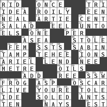 ACROSS 1. To free from 4. At one time in the past 8. Three (prefix) 11. The content of cognition 13. Agitated, as a liquid 15. Car or cant ending 16. Actress Patricia 17. Nick name for Arthur 18. Penny 19. Vegetable dish 21. Snakelike fish 22. To (old English) 23. Raised railways 24. Single 27. For each 29. Toward the sea 30. Fur scarf 34. Opposite of masc. 36. Fast planes 39. Unit of acoustic absorption 40. Pack (down) 41. Giggle 43. Charged particles 44. Satellite of Uranus 46. Grant temporary use of 47. Born 48. Distance measurement (Brit.) 49. Petroleums 51. Increase 53. To separate or throw off 54. Compass dir. 57. Tree-dwelling hopper 60. Viper 63. Motion picture award 65. Moving, as bait 66. You are 69. Lacquered or enameled metalware 70. Binary compound 71. Having a sole or soles 72. Pismires 73. "___ Little Indians" 74. Negative votes 75. Eastern Standard Time (abbr.) DOWN 1. Remove soap 2. Standard of perfection 3. Allots cards 4. Mouth or opening 5. Or not 6. Quote 7. Writer Wiesel 8. Adolescent 9. Monthly bill 10. To the inside or interior of 12. Insect wing 14. Sharp bark 18. Window treatments 20. Two (Sp.) 25. Egg locale 26. Artist's stand 28. Curvy letter 29. Electrical Measurement 31. Mitch Miller's instrument 32. Actor's bit 33. Followers of ems 34. Conductor's collection 35. Send forth 37. Definite Article 38. Sir (Sp.) 40. Scottish cap 42. Singer Brickell 45. Directed 50. Lion 52. 24-hour periods 54. Biscuitlike quick bread 55. Table seasonings 56. Take or capture by force 57. Sudden quick movement 58. Travel on an animal 59. Baking chamber 61. Within a short period 62. Monetary unit of Botswana 64. R.R. building 67. Marina Del _, California 68. Begley and Asner
