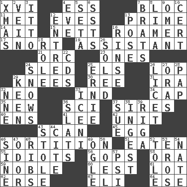 ACROSS 1. 16 4. Double-curved letter 7. Alliance 11. Was introduced to 12. Nights before holidays 13. First class 14. Small island 15. Remaining after all deductions 16. Nomad 17. Derisive sound 19. Helper 21. The grampus (Milton) 23. Washington bills 24. Downhill vehicle 25. Raised railways 26. Trim (branches) 29. Leg joints 30. To riddle 31. Retirement account (abbr.) 32. Modern: prefix 33. Working for oneself (abbr.) 34. Head covering 35. ___ Haven, CT 36. _-fi 37. Male parents of animals 40. Followers of ems 41. Area sheltered from the wind 42. A single undivided whole 43. Glance over 45. Ovum 46. Conclusion 51. Eroded 55. Foolish or stupid persons 56. Republicans 58. Mouth or opening 59. Impressive in appearance 60. For fear that 61. Car dealer's back yard 62. Celtic language 63. Connecticut Ivy Leaguer 64. Compass dir. DOWN 1. Dec. holiday 2. Distinctive style or manner 3. "Tell ____ the Marines!" 4. First lady 5. Bristle 6. Fast planes 7. Naughty children 8. Pale green bean 9. Sign of things to come 10. Foregone conclusion 12. Main course 13. Airs 16. Remove soap 18. Hero or heavy, e.g. 20. Having a sole or soles 22. Music discs 24. Overwhelms 25. Bert's buddy 26. It is permitted: Lat. 27. Mouths or openings 28. Infant food 29. Peachy ____! 32. Compass dir. 33. Ancient Celtic tribe of eastern Britain 36. Narrow boards 37. Take to court 38. Consume 39. Capital of Latvia 43. Fur scarf 44. Quote 46. Trig term 47. Scent 48. Chest bones 49. Stare 50. Christmas carol 52. Lacquered or enameled metalware 53. Greek god of love 54. Nathan's nickname 57. 23rd letter of the Greek alphabet