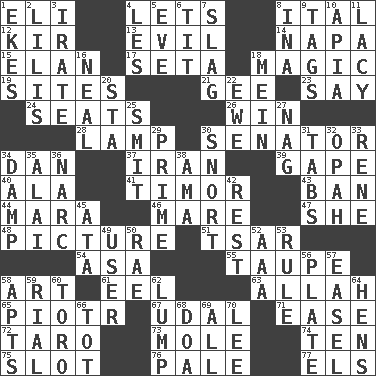 ACROSS 1. Biblical high priest 4. Allows 8. Slanted text style (abbr.) 12. Apertif with cassis 13. Morally bad or wrong 14. California wine valley 15. Flair 17. Stalk of a moss capsule 18. Mysterious quality of enchantment 19. Locates 21. Turn to the right 23. Declare 24. Theater features 26. Acquire through effort 28. Desk light 30. Elected representative 34. Daniel's nick name 37. SW Asia republic 39. Open wide 40. Chicken ___ king 41. The easternmost of the Lesser Sundas 43. Bar 44. Hindu Mythology: god of death 46. Female horse 47. A female animal or person 48. Photo 51. Russian ruler of old 54. White ___ sheet 55. Grayish beige 58. Tate display 61. Snakelike fish 63. Assad's deity 65. Peter (Polish) 67. Freehold land 71. Comfort 72. Edible starchy tuberous root 73. Undercover agent 74. "___ Little Indians" 75. Notch 76. Light colored 77. Raised railways DOWN 1. Makes supply last 2. Ms. Damita and namesakes 3. Feeling or showing extreme anger 4. French article 5. Night before a holiday 6. Teat (slang) 7. Volcanic refuse 8. _ tizzy (2 wds.) 9. Labels 10. Capital of Western Samoa 11. Made of lace 16. Anneal 18. Count _ (2 wds.) 20. R.R. building 22. She-sheep 25. Stricken, poetically 27. Tired old horse 29. A-one 30. Derisive sound 31. Bar bills 32. Brightly colored fish 33. French philosopher Descartes 34. Moist 35. Mountain range southwest of Kyrgyzstan 36. Drug cop 38. Housemaid (var.) 42. Remainder 45. "One Day ___ Time" 49. One who makes use of a thing 50. Actress Charlotte 52. American Automobile Association (abbr.) 53. Governing power 56. Food holder 57. Artist's stand 58. Tenement units (abbr.) 59. Monetary unit of Yemen 60. "Corrida" creature 62. Mass 64. Coop moms 66. Small child 68. ___ good deed 69. Everything 70. Area sheltered from the wind