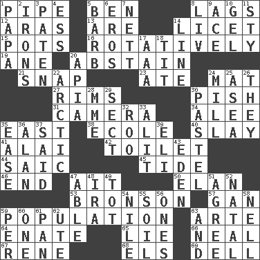 ACROSS 1. Corncob 5. Benjamin's nick name 8. Fails to keep up a pace 12. Caspian sea tributary 13. "We ___ not amused" (Victoria) 14. It is permitted: Lat. 15. Cooking vessels 16. Producing rotation 19. A saturated hydrocarbon 20. Refrain by choice 21. Fastener 23. Had dinner 24. Floor covering 27. Basketball hoops 30. Expression of disdain 31. Device for capturing images 34. Toward shelter 35. 90 degrees 38. Learning spot: Fr. 40. Kill 41. Mountain range southwest of Kyrgyzstan 42. Bathroom plumbing fixture 44. Ketch in the Levant 45. Periodic rise and fall of the sea level 46. Conclude 47. Small island 50. Enthusiasm 53. "Death Wish" actor 57. Separate the seeds from cotton 59. Census information 63. Johnson of "Laugh-In" 64. Related on the mother's side 65. Whopper 66. Anneal 67. French philosopher Descartes 68. Raised railways 69. Small valley DOWN 1. Dad 2. Metal shackles 3. Eucharist need 4. Curvy letter 5. Sharp remark 6. Greek god of love 7. Remaining after all deductions 8. 54 in ancient Rome 9. Adept person 10. Set 11. Filthy place 14. Actor's bit 17. Auto club (abbr.) 18. Teat (slang) 20. Capital of Western Samoa 22. Northern region 24. Place where flour is made 25. At sea 26. Those things 28. Madame (abbr.) 29. Religious group 30. Soft color 32. Friend of Pooh 33. Came down and settled, as after flight 35. Comfort 36. ____ Jay Lerner 37. Stated 39. Biblical high priest 43. Genesis locale 47. Competent 48. Retirement account (abbr.) 49. Small child 51. Match 52. Relating to or accompanying birth 54. Mediterranean tributary 55. The visible part of the earth's surface 56. Singles 58. 1994 drama film starring Jodie Foster 59. For each 60. Single 61. Baking dish 62. Shoshoni 63. Added to