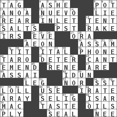 ACROSS 1. Label 4. American tennis player Robert 8. Cooking vessel 11. Small Philippine buffalo 13. New (sp.) 15. Falsehood 16. Stern 17. An arm off of a larger body of water 18. Portable shelter 19. Table seasonings 21. Pacific Standard Time (abbr.) 22. Libertine 23. Big collection agency 24. First lady 27. Mouth or opening 29. A really long time 30. Indian state 34. Teat (slang) 36. Slanted text style (abbr.) 39. Give a jingle 40. Pacific island yam 41. Prevent from occurring 43. Patter 44. Make improvements or corrections to 46. French philosopher Descartes 47. "We ___ not amused" (Victoria) 48. Slender Brazilian palm 49. Goddess of spring and wife of Bragi 51. Part of a journey 53. Or not 54. Fast jet (abbr.) 57. Hang loosely or laxly 60. Purpose 63. Feeling or showing extreme anger 65. Like ___ of sunshine 66. Major League Baseball Commissioner Bud 69. Austrian river, tributary to the Danube 70. Apple computer (short form) 71. Clothes sense 72. Lubricates 73. Strand of rope, yarn or thread 74. Lick closed 75. Born DOWN 1. Tarsus (plural) 2. Approach 3. Scores awarded for successful feats 4. Black tropical American cuckoo 5. Player for Phoenix 6. Assist 7. Nights before holidays 8. Entreaty 9. Pig sound 10. False hair 12. Nonscientific branch of learning 14. "Beetle Bailey" pooch 18. File 13 20. Observe 25. Empty area or space 26. Keyboard key 28. Strike 29. Without tonality 31. Fly high 32. Singer Murray 33. Was introduced to 34. Scottish caps 35. Angers 37. Had dinner 38. Soviet premier 1918-24 40. Afternoon social gathering 42. Redecorate 45. Pass on 50. RI univ. 52. Abrupt rush of wind 54. Indian antelope 55. Showing deterioration from age 56. Laconic 57. Desk light 58. Spoken 59. Made of lace 61. Oceans 62. Otherwise 64. _ de Janeiro 67. Call ___ day 68. Set