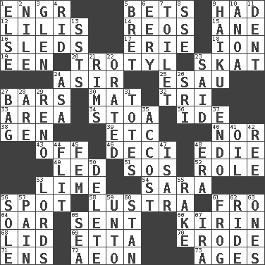 ACROSS 1. Engineer (abbr.) 5. Stakes 9. Possessed 12. Ms. Damita and namesakes 14. Vintage cars 15. A saturated hydrocarbon 16. Bobsleighs 17. One of the Great Lakes 18. Electrically charged atom 19. Car or cant ending 20. TNT 23. Three-handed card game 24. SW Saudi Arabia district 25. Son of Isaac 27. Oblong pieces of solid material 30. Floor covering 32. Three (prefix) 33. Length times width 34. Portico 36. Binary compound 38. Commissioned mil. rank 39. And so on (abbr.) 40. Or not 43. Below a satisfactory level 46. Tenth: prefix 48. Singer Brickell 49. Directed 51. Mayday 52. Hero or heavy, e.g. 53. Welles in "The Third Man" 54. "Two Mules for Sister ____" 56. Specific locale 58. A period of five years 61. From 64. Rowing implement 65. Transmitted 66. Japanese brewing company 68. Hat (slang) 69. Singer James 70. Wear away 71. Followers of ems 72. Age 73. Ripens DOWN 1. Otherwise 2. The longest river in the world 3. Small, secluded valley 4. To free from 5. Cy Young winner Saberhagen 6. Suggestive of the supernatural 7. Rest room 8. Compass dir. 9. Japanese verse 10. Small Philippine buffalo 11. Gouge 13. Fast planes 21. Basketball hoops 22. Spoke pompously 23. Stated 24. White ___ sheet 26. _ Lanka 27. Container for groceries 28. "We ___ not amused" (Victoria) 29. Western Nevada city 31. Lugs 35. Buttonhole 37. Inside; within (prefix) 41. Petroleum 42. To separate or throw off 44. Secret move to avoid paying debts 45. Opposite of masc. 47. Austrian river, tributary to the Danube 48. Period 50. Erase 53. Titled peers of a realm 55. Libertine 56. Not divided or shared with others 57. Ache 59. To (old English) 60. Comedian Laurel of Laurel & Hardy 61. Toadlike animal 62. Travel on an animal 63. Singles 65. Ocean 67. Retirement account (abbr.)