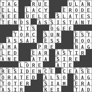 ACROSS 1. Label 4. Sorrow 7. ____ Bator 11. Pipe bend 12. Made of lace 13. Eat (away) 14. Born 15. Ubangi River tributary 16. Chalkboards 17. Watches over 19. Aide 21. ___ a Wonderful Life 23. Double curve, resembling the letter S 24. Torque (variant) 25. Player for Phoenix 26. Eastern Standard Time (abbr.) 29. Slender Brazilian palm 30. Double-curved letter 31. Friend of Pooh 32. Housemaid (var.) 33. Before (prefix) 34. Tired old horse 35. Directed 36. Ewer handle 37. Moving or stirring 40. A saturated hydrocarbon 41. _ moment's notice (2 wds.) 42. Father 43. Old wives' tales, e.g. 45. Had dinner 46. Dwelling 51. Desist 55. Spoke pompously 56. In addition 58. Container for groceries 59. Carrier 60. Thailand, formerly 61. Epoch 62. SW Saudi Arabia district 63. Dry husk or covering 64. Bit DOWN 1. Portable shelter 2. Toward shelter 3. Small, secluded valley 4. Actress Charlotte 5. Southern CA. univ. 6. Sight organs 7. A salt of uric acid 8. Globular water bottle used in Asia 9. Arabian gulf 10. A home for chicks 12. A period of five years 13. Otherwise 16. Public displays of written messages 18. "Vaya con ____" 20. Boozer 22. _-fi 24. Sadhe (variant) 25. Spanish missionary in California 26. Bert's buddy 27. Fly high 28. Coat; cloak 29. So be it 32. Insect wing 33. Eucharist need 36. Having ears or earlike features 37. White ___ sheet 38. "Cheers" or "Ellen" 39. Woody plant 43. 61 cubic inches 44. Baltic tributary 46. Round or rotation of duties 47. Greek god of love 48. Suttee (variant) 49. Keg 50. Writer Wiesel 52. Collude with 53. "Two Mules for Sister ____" 54. Mild oath 57. Saxophone