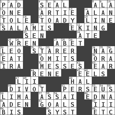 ACROSS 1. Writing tablet 4. Lick closed 8. Wing 11. Single 12. Nick name for Arthur 14. Actor Alda or Thicke 15. Lacquered or enameled metalware 17. Sycophant 18. Actor's bit 19. Deli grouping 21. Supplementing with great effort 23. Elected rep. 24. Had dinner 25. Songbird 27. Collude with 30. Lion 31. A viewer who gazes fixedly 34. Tired old horse 37. Consume 38. Leaves out 39. Mouth or opening 40. Retirement account (abbr.) 41. Makes clutter 43. Hearing organ 44. French philosopher Descartes 45. Snakelike fish 47. Cards in a Roman deck? 49. Actor Linden 50. A piece of turf (Scot.) 52. Son of Zeus who helped slay Medusa 56. Pale green bean 57. Slender Brazilian palm 60. Pulitzer Prize-winning author Ferber 61. Arabian gulf 62. Scores awarded for successful feats 63. One more than two 64. Twice 65. System (abbr.) 66. And so on (abbr.) DOWN 1. Cooking vessels 2. Small Philippine buffalo 3. Small valley 4. Smooth fabric 5. Greek god of love 6. _ moment's notice (2 wds.) 7. Flaplike covering 8. Place in a line 9. Austrian-born American filmmaker Fritz 10. One (Scot) 13. Sight organ 14. Set down 16. Relaxation 20. Not women's 22. Krazy ___ of comics 25. Erode 26. Roll call or roster of names 27. Get up 28. Wagers 29. Celtic language 30. Luau accessory 32. Heavy book 33. So be it 34. Christmas carol 35. Ancient river in northeast Turkey 36. Slender fish 42. Dry up 44. River (Sp.) 46. Otherwise 47. Citrus fruits 48. _ the terrible 49. Robbery 50. "You Light Up My Life" star Conn 51. Label 52. Friends 53. Singer Brickell 54. A single undivided whole 55. Ketch in the Levant 56. Experiment locale 58. Distress signal 59. Declare