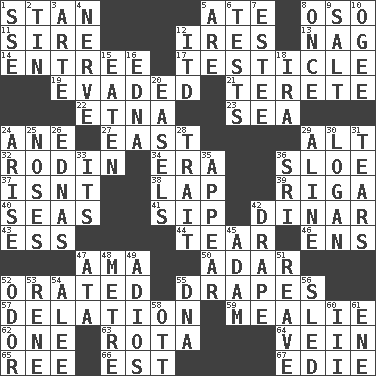 ACROSS 1. Comedian Laurel of Laurel & Hardy 5. Had dinner 8. Bear (Spanish) 11. Beget 12. Angers 13. Tired old horse 14. Main course 17. One of the two male reproductive glands 19. Dodged 21. Cylindrical with tapered ends 22. Inactive volcano in Sicily 23. Ocean 24. One (Scot) 27. Compass direction 29. The first octave above the treble staff 32. "The Thinker" sculptor 34. Period 36. A type of plum 37. Is not 38. Pet locale 39. Port city in Latvia 40. Oceans 41. Small drink 42. Middle Eastern gold or silver currency 43. Curvy letter 44. Pull apart 46. Followers of ems 47. Nursemaid (var.) 50. The sixth month of the Jewish calendar 52. Spoke pompously 55. Window treatments 57. Accusation by an informer 59. Ear of corn 62. Single 63. Roll call or roster of names 64. Distinctive style or manner 65. To separate or throw off 66. Eastern Standard Time (abbr.) 67. Singer Brickell DOWN 1. Compass dir. 2. Shallow baking pan 3. Johnson of "Laugh-In" 4. Impudent aggressiveness 5. "We ___ not amused" (Victoria) 6. Trials 7. First name in cosmetics 8. Single time 9. Table seasoning 10. Double curve, resembling the letter S 12. It would 15. Eroded 16. Pulitzer Prize-winning author Ferber 18. Retirement account (abbr.) 20. Artist's stands 24. Ascend 25. Olfactory organs 26. Ferber et al. 28. Distinguishing feature 29. Place in a line 30. Utah city north of Ogden 31. Rends 33. ___ a Wonderful Life 35. Become visible 36. Indian title of respect (Mr.) 42. Window treatment 45. First of billions? 47. _ moment's notice (2 wds.) 48. Distance measurement (Brit.) 49. Goodbye (Sp.) 51. Break or tear apart 52. Scent 53. French philosopher Descartes 54. Toward shelter 55. Heredity factor (abbr.) 56. Downhill vehicle 58. Baseball player Mel 60. One more than two 61. Compass dir.