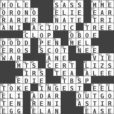 ACROSS 1. Opening into or through something 5. Backtalk 9. Madame (abbr.) 12. U. of Maine site 14. Writer Wiesel 15. Ewer handle 16. More uncommon 17. Nathan's nickname 18. Three (prefix) 19. Black tropical American cuckoo 20. Being or containing an acid 23. Family _ (genealogy) 24. Hoof sound 25. Mitch Miller's instrument 27. Texas town _ City 30. Fenced enclosure 32. Cartoonist voice _ Blanc 33. Greek god of love 34. Native of Scotland 36. Born 38. Armed conflict 39. One (Scot) 40. Compete 43. Mountains (abbr.) 46. Sure thing 48. Belonging to Elizabeth 49. Big collection agency 51. Beverage made from leaves 52. Toward shelter 53. Singer Brickell 54. Cook's measure (abbr.) 56. Casino tip 58. Consume 61. Snakelike fish 64. Connecticut Ivy Leaguer 65. The sixth month of the Jewish calendar 66. Expenditure 68. Nine, plus one 69. Painter Guido (1575-1642) 70. Having gotten out of bed 71. Oval reproductive body of a fowl 72. Flair 73. Comfort DOWN 1. Israeli folk dance 2. Northwest Algerian city 3. Australian parrot (variant) 4. Compass dir. 5. Transmit 6. Jai _ 7. "Cheers" or "Ellen" 8. Observe 9. Distance measurement (Brit.) 10. Female horse 11. 4th largest of the Great Lakes 13. Of the mouth 21. 911 reaches them 22. Medicinal drug used to evoke vomiting 23. Lacquered or enameled metalware 24. Music discs 26. Benjamin's nick name 27. Morning condensation 28. Mouth or opening 29. Dormintory (informal) 31. Music written for nine 35. Cigar-shaped 37. Morally bad or wrong 41. Ending with capital 42. Compass dir. 44. Event that recurs at intervals 45. Indian title of respect (Mr.) 47. Bar bills 48. Infant locale 50. A glass for beer 53. Supplementing with great effort 55. Portico 56. False hair 57. Cassini of fashion 59. Nanny 60. Amused look 61. Singer James 62. Armor plate that protects the chest 63. Old wives' tales, e.g. 65. "We ___ not amused" (Victoria) 67. Purpose