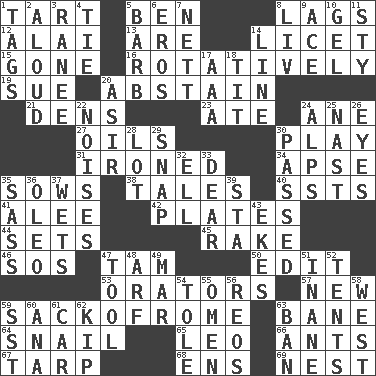 ACROSS 1. Small pie 5. Benjamin's nick name 8. Fails to keep up a pace 12. Mountain range southwest of Kyrgyzstan 13. "We ___ not amused" (Victoria) 14. It is permitted: Lat. 15. Went 16. Producing rotation 19. Take to court 20. Choose not to consume 21. Lairs 23. Had dinner 24. One (Scot) 27. Lubricates 30. Frolic 31. Pressed 34. Domed church section 35. Sty mamas 38. Falsehoods 40. Fast planes 41. Toward shelter 42. Food holders 44. Arranges properly for use 45. Libertine 46. Mayday 47. Scottish cap 50. Prepare for publication 53. Speakers 57. ___ Haven, CT 59. Italian handbag shop? 63. Object of repulsion 64. Slow-paced one 65. Lion 66. Pismires 67. Canvas cover 68. Followers of ems 69. Egg locale DOWN 1. Labels 2. Verbally 3. Indian princess (variant) 4. Neckwear 5. Sharp remark 6. Greek god of love 7. Remaining after all deductions 8. 54 in ancient Rome 9. Adept person 10. Set 11. Filthy place 14. Actor's bit 17. American Automobile Association (abbr.) 18. Teat (slang) 20. SW Saudi Arabia district 22. Annoying sounds 24. High mountains 25. Political cartoonist Thomas 26. Snake ____ (dice throw) 28. Car dealer's back yard 29. Fastener 30. Went by 32. Pipe bend 33. Letter starter 35. Backtalk 36. Butter sub 37. Soaks 39. R.R. building 43. Makes supply last 47. Instrument 48. Sandy's bark 49. Third mo. 51. Silly 52. Portable shelters 54. Lacquered or enameled metalware 55. Presage 56. Vintage cars 58. Compass direction 59. Fast jet (abbr.) 60. Santa ___, CA 61. 4-wheeled motor vehicle 62. Monetary unit of Laos 63. Prohibit