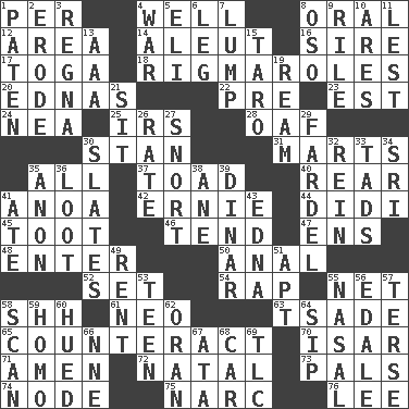 ACROSS 1. For each 4. Water source 8. Relating to the mouth 12. Length times width 14. Eskimo relative 16. Male parent of an animal 17. Ancient Roman robe 18. Complicated, petty procedures 20. Ferber et al. 22. Before (prefix) 23. Eastern Standard Time (abbr.) 24. Teachers' org. 25. Big collection agency 28. Clumsy lout 30. Comedian Laurel of Laurel & Hardy 31. Shops 35. 100% 37. Frog relative 40. Posterior 41. Small Philippine buffalo 42. Bert's buddy 44. "You Light Up My Life" star Conn 45. A blast of a horn 46. Watch over 47. Followers of ems 48. Keyboard key 50. Of or related to the anus 52. Arrange properly for use 54. Hit sharply and swiftly 55. Fish or hair follower 58. Quiet! 61. Modern: prefix 63. Sadhe (variant) 65. Act in opposition 70. Austrian river, tributary to the Danube 71. So be it 72. Brizilian seaport 73. Friends 74. Thickened enlargement 75. Drug cop 76. Area sheltered from the wind DOWN 1. Eucharist need 2. Eat (away) 3. Canadian anthropologist Darnell 4. Armed conflict 5. Connecticut Ivy Leaguer 6. Part of a journey 7. Mass 8. Bear (Spanish) 9. Cause heat under the collar 10. Ancient Greek god of war 11. For fear that 13. Auto club (abbr.) 15. Pacific island yam 19. 480, 500 or 516 sheets of paper 21. Be seated 26. Assign a rank or rating to 27. Derisive sound 29. Bundle 30. Chalkboards 32. It's straight from the horse's mouth 33. Small boys 34. _ Lanka 35. Soon (poet.) 36. Spoils 38. A saturated hydrocarbon 39. Middle Eastern gold or silver currency 41. Had dinner 43. Pulitzer Prize-winning author Ferber 49. Monthly bill 51. Fitting 53. Adolescent 55. Relating to the nose 56. Peak District village in England 57. Laconic 58. Glance over 59. Same (prefix) 60. Took on color 62. Northwest Algerian city 64. Small drink 66. Compass dir. 67. "One Day ___ Time" 68. Automobile 69. Affectionate concern, for short