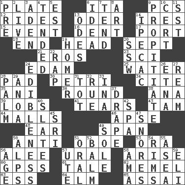 ACROSS 1. Food holder 6. Call ___ day 9. Personal Computers (abbr.) 12. Amusement-park features 13. River in Europe 14. Angers 15. Happening 16. Gouge 17. Left side of a ship or aircraft 18. Conclusion 19. Froth on beer 20. Back-to-school mo. 21. Greek god of love 23. _-fi 24. Dutch treat 25. Wetness 28. Groovy apt. 30. _ dish (used to culture cells) 34. Quote 35. Cuckoo 36. Unit of ammunition 38. Santa ___, CA 39. Tennis shots 41. Pulls apart 43. Scottish cap 44. Promenades 46. Domed church section 48. Hearing organ 49. Connect, as a bridge 50. Opposed to 51. Mitch Miller's instrument 53. Mouth or opening 56. Toward shelter 57. Mountain range 58. Ascend 60. Global Positioning Systems (abbr.) 61. Lie 62. Klaipeda city 63. Double-curved letter 64. Shade tree 65. Slender Brazilian palm DOWN 1. Before (prefix) 2. Not recorded 3. An important port of Yemen 4. Looked after 5. Eastern Standard Time (abbr.) 6. The main thing one is thinking about 7. Watch over 8. Nonscientific branch of learning 9. Conciliate 10. Sure thing 11. Fast jet (abbr.) 13. Lyric poems 14. Medicinal drug used to evoke vomiting 19. Simpsons dad 20. Compass dir. 22. Reproach for some lapse or misdeed 24. The property of being fit to eat 26. Inactive volcano in Sicily 27. 480, 500 or 516 sheets of paper 28. Inside of hand 29. Small Philippine buffalo 31. Small child 32. Sorrow 33. _ tizzy (2 wds.) 37. Window treatment 40. Chalkboards 42. Health resort 45. Indian title of respect (Mr.) 47. Sounds asleep 49. Not divided or shared with others 50. High mountains 51. Of the mouth 52. Lip ointment 54. Basketball hoops 55. Toward the sea 56. Ripen 57. Shoshoni 58. Nursemaid (var.) 59. Biblical high priest