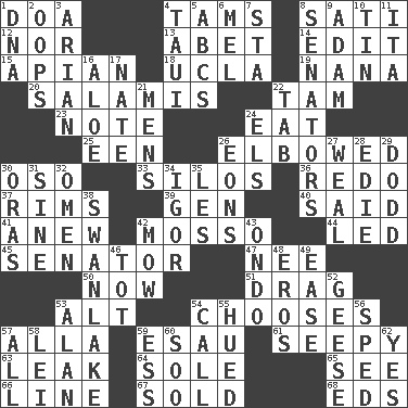 ACROSS 1. ___ good deed 4. Scottish caps 8. Suttee (variant) 12. Not either 13. Collude with 14. Prepare for publication 15. Bee-related 18. Southern CA. univ. 19. Nanny 20. Deli grouping 22. Scottish cap 23. Brief written record 24. Consume 25. Car or cant ending 26. Shoved, as through a crowd 30. Bear (Spanish) 33. Grain storage towers 36. Make new 37. Basketball hoops 39. Commissioned mil. rank 40. Expressed in words 41. Afresh 42. With motion or animation 44. Directed 45. Legislator 47. Born 50. Immediately 51. To draw with force 53. Keyboard modifier key 54. Opts 57. Silent film actress Nazimova 59. He sold his birthright 61. Not well drained, as in land 63. Path through which fluid escapes 64. Flatfish 65. Observe 66. Actor's bit 67. Exchanged or delivered for money 68. Begley and Asner DOWN 1. Heredity factor (abbr.) 2. I made a mistake 3. Believer in; advocate of (suffix) 4. "Change" in Tahitian 5. Lettered men learn these first 6. Cartoonist voice _ Blanc 7. R.R. building 8. Legislators 9. First man 10. Shallow baking pan 11. Call ___ day 16. Medicinal plant 17. Nathan's nickname 21. Not women's 22. Keyboard key 24. Raised railways 26. Immeasurably long periods of time 27. Welt 28. Singer Brickell 29. Texas town _ City 30. Mouths or openings 31. Trig term 32. Presage 34. Composer Stravinsky 35. French article 38. Tchaikovsky ballet 42. Cut the grass 43. Southwest Nigerian state 46. Small child 48. Greek god of love 49. Relaxation 52. Honkers 53. Actor Alda or Thicke 54. Give a ring to 55. Took on color 56. Moved rapidly 57. Everything 58. Flowery wreath 59. Double-curved letter 60. "Barney Miller" actor Jack 62. Affirmative reply