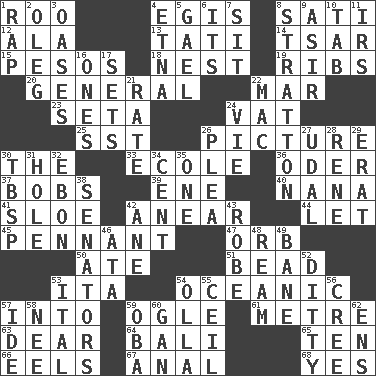 ACROSS 1. Friend of Pooh 4. The front part of a cuirass 8. Suttee (variant) 12. In the manner of 13. Jacques of French films 14. Russian ruler of old 15. Mexican monetary units 18. A home for chicks 19. Chest bones 20. Commissioned military rank 22. Third mo. 23. Stalk of a moss capsule 24. Large container 25. Fast jet (abbr.) 26. Photo 30. Definite Article 33. Learning spot: Fr. 36. River in Europe 37. Moves up and down 39. Compass dir. 40. Grandmother 41. A type of plum 42. Approach 44. Allow 45. Pre-World Series prize 47. Globe 50. Had dinner 51. Necklace unit 53. Call ___ day 54. Pertaining to the sea 57. To the inside or interior of 59. Stare at amorously 61. Distance measurement (Brit.) 63. Letter starter 64. Indonesian resort city 65. Nine, plus one 66. Snakelike fish 67. Of or related to the anus 68. Affirmative reply DOWN 1. Reproach for some lapse or misdeed 2. Cassini of fashion 3. Fertile tracts in a desert 4. Inactive volcano in Sicily 5. Highlander 6. ___ a Wonderful Life 7. Be seated 8. Ski resort town in Vermont 9. SW Saudi Arabia district 10. Keyboard key 11. Big collection agency 16. Singles 17. Arranges properly for use 21. Assign a rank or rating to 22. Apple computer (short form) 24. Compete 26. Entreaty 27. Freehold land 28. French philosopher Descartes 29. Part of Q.E.F. 30. Cook's measure (abbr.) 31. Hollow 32. Inky black, to poets 34. Penny 35. Single 38. Elected representatives 42. One (Scot) 43. Loose flowing garment 46. "One Day ___ Time" 48. 480, 500 or 516 sheets of paper 49. Object of repulsion 52. Short, simple song 53. Slanted text style (abbr.) 54. Spanish pot 55. To provide with a ceiling 56. Algonquian 57. Binary compound 58. Born 59. Chief or king in Benin or Nigeria 60. Separate the seeds from cotton 62. Followers of ems