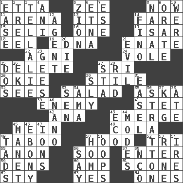 ACROSS 1. Singer James 5. Last letter of the English alphabet 8. Immediately 11. Sports stadium 13. ___ a Wonderful Life 14. Conductor's collection 15. Major League Baseball Commissioner Bud 16. Single 17. Austrian river, tributary to the Danube 18. Snakelike fish 19. Pulitzer Prize-winning author Ferber 21. Related on the mother's side 22. Hindu god of fire 24. Short-tailed, large-bodied rat 25. Keyboard key 27. _ Lanka 29. Migrant worker of the '30s 30. Vertical member of a panel or frame 32. Observes 33. Vegetable dish 35. "____ silly question..." 39. Foe 41. Proofreading order 42. Santa ___, CA 43. Develop 45. Chow _ 48. Root beer relative 49. Off limits 50. Parka part 52. Three (prefix) 55. Soon (poet.) 56. "Barney Miller" actor Jack 57. Keyboard key 59. Habitations of wild animals 60. Electrical Unit 61. Biscuitlike quick bread 62. Filthy place 63. Affirmative reply 64. Singles DOWN 1. Relaxation 2. Woody plant 3. Copy Pinocchio 4. Cuckoo 5. The Jewish people; Israel 6. Inactive volcano in Sicily 7. Compass dir. 8. Rhinal 9. Speak pompously 10. Past tense of be (plural) 12. Rep 14. Fine (Spanish) 20. Expire 21. Morally bad or wrong 23. Honkers 25. Two (Sp.) 26. Supplement with great effort 27. R.R. building 28. To free from 30. Secret 31. Artist's stand 33. Elected rep. 34. Housemaid (var.) 36. Ski resort town in Vermont 37. Barrel 38. Had dinner 40. Billionth: prefix 43. Environmental prefix 44. Methods 45. French painter Edouard 46. Black 47. Charged atoms 49. Small amounts or degrees 50. Residence 51. I made a mistake 53. French philosopher Descartes 54. Angers 56. Declare 58. Non-commissioned officer (abbr.)