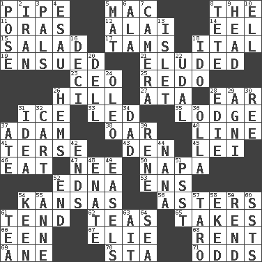 ACROSS 1. Corncob 5. Apple computer (short form) 8. Definite Article 11. Mouths or openings 12. Jai _ 14. Snakelike fish 15. Vegetable dish 17. Scottish caps 18. Slanted text style (abbr.) 19. Followed as a consequence or result 21. Dodged 23. Corporate head (abbr.) 25. Redecorate 26. Land elevation 27. _ moment's notice (2 wds.) 28. Ewer handle 31. Frozen water 33. Directed 35. Cabin 37. First man 38. Boat paddle 40. Actor's bit 41. Laconic 43. Lair 45. Luau accessory 46. Consume 47. Born 50. California wine valley 52. Pulitzer Prize-winning author Ferber 53. Followers of ems 54. Sunflower state 56. Michaelmas daisies 61. Look after 62. Beverages made from leaves 65. Proceeds 66. Car or cant ending 67. Writer Wiesel 68. Monthly bill 69. A saturated hydrocarbon 70. R.R. building 71. Probability DOWN 1. Introduce or present, as a question 2. SW Asia republic 3. Friends 4. He sold his birthright 5. Floor protector 6. In the manner of 7. Device for capturing images 8. Wig 9. Froth on beer 10. Pipe bend 13. Small island 16. Tenth: prefix 18. Wedding promise 20. Small valley 22. Hereditary estate 24. Butter sub 26. Equivocates 28. Singer Brickell 29. Hindu god of fire 30. To separate or throw off 31. The main thing one is thinking about 32. Draw slowly or heavily 34. June honoree 36. Water jar 37. Had dinner 39. French philosopher Descartes 42. Extremities 44. Nanny 48. Maternal 49. Artist's stands 51. Inconspicuous attention getter 52. Conclude 54. Peachy ____! 55. Singer Murray 57. Edible starchy tuberous root 58. Supplemented with great effort 59. Tear apart 60. Fast planes 61. Afternoon social gathering 63. Small island 64. Ocean
