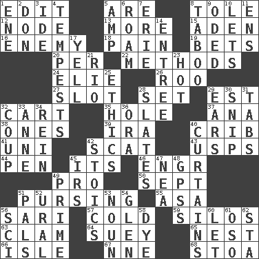ACROSS 1. Prepare for publication 5. "We ___ not amused" (Victoria) 8. Lacquered or enameled metalware 12. Connecting point 13. Greater amount 15. Arabian gulf 16. Foe 18. Ache 19. Stakes 20. For each 22. Modes 24. Writer Wiesel 26. Friend of Pooh 27. Narrow opening 28. Put into a specified state 29. Eastern Standard Time (abbr.) 32. Haul 35. Hollow 37. Santa ___, CA 38. Singles 39. Retirement account (abbr.) 40. Baby bed with high sides 41. Corn or form start 42. Jazz singing style 43. United States Postal Service (abbr.) 44. Writing instrument 45. ___ a Wonderful Life 46. Engineer (abbr.) 49. Adept person 50. Back-to-school mo. 51. Puckering 55. White ___ sheet 56. Indian skirt 57. Lacking warmth 59. Grain storage towers 63. Burrowing marine mollusk 64. Chop _ 65. Egg locale 66. Capri or Wight 67. Compass dir. 68. Portico DOWN 1. Compass dir. 2. Spanish title 3. Binary compound 4. Storms 5. Electrical Unit 6. Wander aimlessly 7. 4th largest of the Great Lakes 8. Off limits 9. Wrote a lyric poem 10. Allows 11. Followers of ems 14. Main course 17. Shout 21. _ de Janeiro 23. Being at a high temperature 25. Moral principles 28. Chalkboards 29. Hearing organs 30. Clip 31. Bar bills 32. Clever action or accomplishment 33. Queen of England 1702-14 34. It's straight from the horse's mouth 36. Mouth or opening 40. Window treatments 42. Unemotional ones 45. Big collection agency 47. Teachers' org. 48. Global Positioning Systems (abbr.) 49. A-one 51. Friends 52. Mountain range 53. Part of speech 54. Small, secluded valley 56. _-fi 58. Color 60. Allow 61. Bear (Spanish) 62. R.R. building
