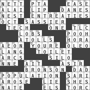 ACROSS 1. Remaining after all deductions 5. Parent Teacher Assoc. 8. Comfort 12. Mountain range southwest of Kyrgyzstan 13. Mouth edge 14. Natives or inhabitants of Denmark 15. A home for chicks 16. Pleas 19. Sep. follower 20. More impudent 21. Technical 23. Single 24. Affectionate concern, for short 27. Tennis shots 30. "Silly old bear" 31. Ringlike coral islands and reefs 34. Israeli folk dance 35. Period of immesurable duration 38. You are 40. Butter sub 41. Long (Scottish) 42. Rest room 44. Arches 45. Grain storage tower 46. Compass dir. 47. Small island 50. SW Saudi Arabia district 53. "Death Wish" actor 57. Male parent 59. Census information 63. Indian skirt 64. Came up 65. Untruth 66. "______ My Girl" (Turtles hit) 67. Nathan's nickname 68. Raised railways 69. Torque (variant) DOWN 1. Billionth: prefix 2. Voters do this 3. Clothes sense 4. Teat (slang) 5. Entreaty 6. Canisters 7. Flats, for short 8. Erode 9. Black tropical American cuckoo 10. Observe 11. Curvy letter 14. Have the gumption 17. _ de Janeiro 18. Car or cant ending 20. Went for two points 22. Gives out a loud, resonant sound 24. Utensil 25. Old wives' tales, e.g. 26. US Secretary of Labor Elaine L. _ 28. Male child 29. Slit 30. Pictures 32. Nilotic language 33. Indian titles of respect 35. Actor Alda or Thicke 36. Merit 37. At one time in the past 39. Biblical high priest 43. Style 47. Competent 48. Retirement account (abbr.) 49. Small child 51. Potato state 52. More uncommon 54. Mediterranean tributary 55. The visible part of the earth's surface 56. Singles 58. Flat circle 59. Baking dish 60. Mouth or opening 61. Plant holder 62. Purpose 63. Fast jet (abbr.)