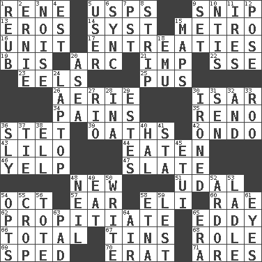 ACROSS 1. French philosopher Descartes 5. United States Postal Service (abbr.) 9. Sever or remove by pinching or nipping 13. Greek god of love 14. System (abbr.) 15. Paris' subway 16. A single undivided whole 17. Pleas 19. Twice 20. Curve 21. Naughty child 22. Compass dir. 23. Snakelike fish 25. Fluid product of inflammation 26. Nest on high 30. Austrian river, tributary to the Danube 34. Aches 35. Western Nevada city 36. Proofreading order 39. Profane or obscene expressions 42. Southwest Nigerian state 43. _ and Stitch 44. Eroded 46. Sharp bark 47. Schedule 48. ___ Haven, CT 51. Hereditary estate 54. Sep. follower 57. Ewer handle 58. Connecticut Ivy Leaguer 60. Actress Charlotte 62. Appease 65. Whirlpool 66. "_____ Recall" 67. Metal containers 68. Hero or heavy, e.g. 69. Moved rapidly 70. Part of Q.E.F. 71. Ancient Greek god of war DOWN 1. Reuben's nickname 2. Bert's buddy 3. Annoying sound 4. Eastern Standard Time (abbr.) 5. One who uses or employs something 6. Synchronize (abbr.) 7. Pacific Standard Time (abbr.) 8. Empty completely 9. Arrange properly for use 10. Nuclear Threat Initiatives 11. Angers 12. Introduce or present, as a question 15. Atlas contents 18. Australian flightless bird 20. Toward the sea 24. Portable computer 27. River (Sp.) 28. _ tizzy (2 wds.) 29. _____ Park, CO 30. Pressed 31. Elected rep. 32. Also 33. Friend of Pooh 36. Roguish 37. Make a knot 38. Pipe bend 40. Actor Linden 41. R.R. building 45. Needle holder 48. Famous astronaut Armstrong 49. Erode 50. Compose 52. Zeal 53. Dipping utensil 54. Chooses 55. Riding implement 56. Lug 58. Inactive volcano in Sicily 59. For fear that 61. Snake ____ (dice throw) 63. Groovy apt. 64. Wind 65. Period