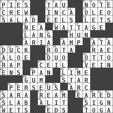 ACROSS 1. Sliced desserts 5. The 19th letter of the Greek alphabet 8. Observe 12. Group working together 13. South American Indian 15. Butter sub 16. First course 18. Snakelike fish 19. Allows 20. Teachers' org. 22. Electrical Measurement 24. Austrian-born American filmmaker Fritz 26. Attila the _ 27. Roberta Peters solo 28. Electrical Unit 29. _ moment's notice (2 wds.) 32. Evade 35. Round or rotation of duties 37. Actress Charlotte 38. Medicinal plant 39. Superhero pair 40. "Beetle Bailey" pooch 41. Reproach for some lapse or misdeed 42. To provide with a ceiling 43. Distinctive style or manner 44. Followers of ems 45. Baking dish 46. Welles in "The Third Man" 49. Chewing product 50. Play the lead 51. Son of Zeus who helped slay Medusa 55. Curve 56. "Two Mules for Sister ____" 57. 480, 500 or 516 sheets of paper 59. Having ears or earlike features 63. Broad, flat, thick piece 64. Came down and settled, as after flight 65. Attach a signature 66. Soaks 67. Begley and Asner 68. Ancient Roman robe DOWN 1. Personal Computers (abbr.) 2. Retirement account (abbr.) 3. Snakelike fish 4. Tchaikovsky ballet 5. Make a knot 6. Afresh 7. Southern CA. univ. 8. Pitcher Ryan 9. Cassini of fashion 10. Wig 11. Greek goddess of the dawn 14. Respiratory problem 17. Letter starter 21. Cuckoo 23. Uncastrated adult male sheep 25. Place where plants grow 28. Ringlike coral islands and reefs 29. Johnson of "Laugh-In" 30. Jacques of French films 31. Age 32. Have the gumption 33. Uhlan (variant) 34. 911 reaches them 36. Fr. "Yes" 40. Cloudy 42. Device for capturing images 45. Purulenc 47. Call ___ day 48. Female horse 49. Takes hold of 51. Light colored 52. Part of Q.E.F. 53. Ubangi River tributary 54. Alleged 56. Compass dir. 58. Mountains (abbr.) 60. River (Sp.) 61. Oval reproductive body of a fowl 62. Heredity factor (abbr.)