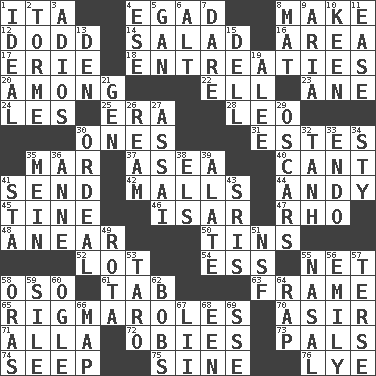 ACROSS 1. Call ___ day 4. Mild oath 8. Cause to be 12. Texas town _ City 14. Vegetable dish 16. Type of rug 17. 4th largest of the Great Lakes 18. Pleas 20. Amid 22. Pipe bend 23. One (Scot) 24. French article 25. Epoch 28. Lion 30. Washington bills 31. _____ Park, CO 35. Make imperfect 37. At sea 40. Patter 41. Transmit 42. Shopping centers 44. Actor Griffith 45. Prong on a fork 46. Austrian river, tributary to the Danube 47. 17th letter of the Greek alphabet 48. Approach 50. Canisters 52. Car dealer's back yard 54. Double-curved letter 55. Fish or hair follower 58. Bear (Spanish) 61. Bar bill 63. Movie unit 65. Frustrating wastes of time 70. SW Saudi Arabia district 71. Silent film actress Nazimova 72. Off-Broadway awards 73. Friends 74. Ooze 75. Trig term 76. Sodium hydroxide DOWN 1. Standard of perfection 2. Singer Mel 3. Goodbye (Sp.) 4. Compass dir. 5. Separate the seeds from cotton 6. Keyboard modifier key 7. Have the gumption 8. Floor covering 9. Operatic vocal solo 10. Peachy ____! 11. Relaxation 13. Lair 15. Small valley 19. Toward shelter 21. Commissioned mil. rank 26. 480, 500 or 516 sheets of paper 27. Slender Brazilian palm 29. Motion picture awards 30. Severe or trying experience 32. Hyperbolic tangent 33. Inside; within (prefix) 34. Filthy place 35. Chow _ 36. Queen of England 1702-14 38. Raised railways 39. Having winglike extensions 41. R.R. building 43. Indian titles of respect 49. Roll call or roster of names 51. Overdraft (abbr.) 53. Pacific island yam 55. Rhinal 56. Poet Dickinson 57. Laconic 58. Mouths or openings 59. Filth; sediment 60. Stare 62. Moves up and down 64. Strike 66. Atlas unit 67. Cards in a Roman deck? 68. Car or cant ending 69. Compass dir.