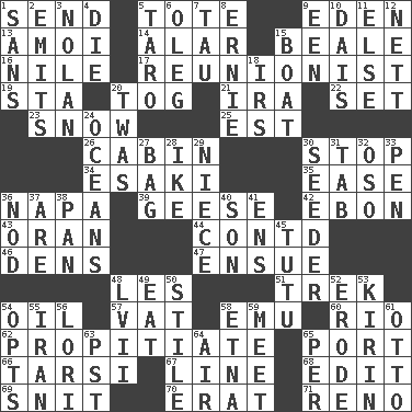 ACROSS 1. Post 5. Lug 9. Genesis locale 13. Mine, in Marseilles 14. Having or resembling wings 15. Calif. Air Force Base 16. The longest river in the world 17. One who advocates reunion 19. R.R. building 20. Coat; cloak 21. Retirement account (abbr.) 22. Arrange properly for use 23. Overwhelm 25. Eastern Standard Time (abbr.) 26. Apartment or room in a ship 30. Constrict 34. 1973 Nobel Price Winner (Physics) Leo 35. Relaxation 36. California wine valley 39. Honkers 42. Inky black, to poets 43. Northwest Algerian city 44. Continued (abbr.) 46. Cub Scout units 47. Take place subsequently 48. French article 51. Long journey 54. Petroleum 57. Large container 58. Australian flightless bird 60. _ de Janeiro 62. Appease 65. Sweet dark-red dessert wine 66. Tarsus (plural) 67. Actor's bit 68. Prepare for publication 69. In a ____ (agitated or irritated) 70. Part of Q.E.F. 71. Former U.S. Attorney General Janet DOWN 1. Without 2. Gives off 3. Pitcher Ryan 4. Expire 5. Pacific island yam 6. Cassini of fashion 7. The 19th letter of the Greek alphabet 8. Bert's buddy 9. Car or cant ending 10. Raised platform 11. Otherwise 12. Remaining after all deductions 15. Water vessel 18. Big collection agency 20. It was, poetically 24. Seas 27. Paper or plastic container 28. D.D.E's nickname 29. Sibling's daughter 30. Sowing specialist 31. Bar bill 32. Bear (Spanish) 33. Fenced enclosure 36. Dreamland 37. "We ___ not amused" (Victoria) 38. Baking dish 40. Boy, to dad 41. Followers of ems 45. Ballerina skirt 48. 57 in ancient Rome 49. Ingest 50. Vertical member of a panel or frame 52. Eat (away) 53. Japanese brewing company 54. Elects 55. SW Asia republic 56. Australian parrot (variant) 58. Inactive volcano in Sicily 59. Confront 61. Von Bismarck 63. Pacific Standard Time (abbr.) 64. Atmosphere 65. For each
