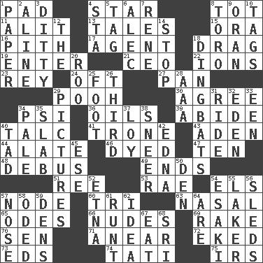 ACROSS 1. Groovy apt. 4. Play the lead 8. Small child 11. Set down 13. Stories 15. Mouth or opening 16. Heart or essence 17. Representative 18. To be drawn or hauled along 19. Keyboard key 21. Corporate head (abbr.) 22. Charged particles 23. Marina Del _, California 24. Often (poetically) 27. Baking dish 29. "Silly old bear" 30. Match 34. Air pressure measure (abbr.) 36. Lubricates 39. Remain 40. Baby powder 41. Heavy duty weighing machine 43. An important port of Yemen 44. Having winglike extensions 46. Colored 47. "___ Little Indians" 48. To get out of a bus 49. Conclusions 51. To riddle 53. Actress Charlotte 54. Raised railways 57. Thickened enlargement 60. Three (prefix) 63. Relating to the nose 65. Lyric poems 66. Unadorned figures 69. Libertine 70. Elected rep. 71. Approach 72. Made supply last 73. Begley and Asner 74. Jacques of French films 75. Big collection agency DOWN 1. Some stationery 2. Place in a line 3. Simple song 4. R.R. building 5. Label 6. Actor Baldwin 7. French philosopher Descartes 8. "Corrida" creature 9. NW Algerian seaport 10. Labels 12. Definite Article 14. Discontinue 18. Empty-headed or silly people 20. Friend of Pooh 25. Lowest support of a structure 26. One of three equal parts 28. Auto club (abbr.) 29. Photos 31. Travel on an animal 32. Paradise 33. Car or cant ending 34. Light colored 35. Thick slice 37. Myrna of the movies 38. Scornful expression 40. Bit 42. Pulitzer Prize-winning author Ferber 45. Compass dir. 50. Lair 52. Inactive volcano in Sicily 54. 1973 Nobel Price Winner (Physics) Leo 55. Member of a famous L.A. basketball team 56. Bobsleighs 57. Olfactory organ 58. Wrote a lyric poem 59. Cub Scout units 61. Undersized animal 62. The content of cognition 64. "We ___ not amused" (Victoria) 67. Erode 68. Indian title of respect (Mr.)