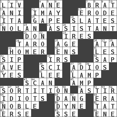 ACROSS 1. 54 in ancient Rome 4. One (Scot) 7. Naughty child 11. Black tropical American cuckoo 12. "If ____ say so..." 13. Eat (away) 14. Call ___ day 15. Stare wonderingly 16. Chalkboards 17. Pitcher Ryan 19. Aide 21. Spanish title 23. Angers 24. Pacific island yam 25. Mature 26. "One Day ___ Time" 29. Homing pigeon 30. Followers of ems 31. French article 32. Small drink 33. Big collection agency 34. Plant excrement 35. "___ Maria" 36. _-fi 37. Goodbye (Sp.) 40. Consenting reply 41. Area sheltered from the wind 42. Desk light 43. Examine minutely or intensely 45. Electrical Unit 46. Drawing lots 51. Moving or stirring 55. Foolish or stupid persons 56. Mild oath, euphamism for damn 58. Epoch 59. Impressive in appearance 60. Centimeter-gram-second unit of force 61. Make lace 62. Celtic language 63. Compass dir. 64. Compass dir. DOWN 1. (Had) reclined 2. To the inside or interior of 3. Small bottle 4. Nanny (var.) 5. California wine valley 6. Sight organs 7. Naughty children 8. Roll call or roster of names 9. An important port of Yemen 10. Trial 12. Refuse to acknowledge 13. Otherwise 16. Founders of families 18. First man 20. Attaches a signature 22. Not either 24. Drinks excessively 25. Nest on high 26. Columnist Joseph or Stewart 27. Beverages made from leaves 28. Viper 29. Hub of activity 32. Declare 33. Ancient Celtic tribe of eastern Britain 36. Narrow boards 37. Chicken ___ king 38. Break 39. Naughty children 43. Took without asking 44. Quote 46. Trig term 47. Aroma 48. Chest bones 49. Likelihood 50. Negative votes 52. False hair 53. SW Asia republic 54. Pace 57. Compass dir.