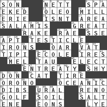 ACROSS 1. Manchild 4. Remaining after all deductions 8. Health resort 11. Made supply last 13. Butter sub 14. Place where flour is made 15. One of the Great Lakes 16. Is not 17. Length times width 18. Deli grouping 21. Relatively large 22. Immoral or dissolute person 23. Actress Charlotte 25. Compass dir. 26. Fitting 29. One of the two male reproductive glands 32. Removes the wrinkles 34. Rowing implement 35. Large container 38. Native american tent (variation) 39. Learning spot: Fr. 41. Angers 43. Cartoonist voice _ Blanc 44. The 19th letter of the Greek alphabet 45. Choose 46. Plea 50. Like a shrinking violet 51. Spanish title 54. Feline 55. Hoop that covers a wheel 57. U. of Maine site 59. Pertaining to the sea 63. Claim 64. Mountain range 67. Former U.S. Attorney General Janet 68. Eighteen holes 69. Land 70. Table seasoning 71. Compass dir. 72. Immeasurably long periods of time 73. Potassium hydroxide DOWN 1. Perceives with the eye 2. Gumbo ingredient 3. Famous astronaut Armstrong 4. Annoying sounds 5. Raised railways 6. Nine, plus one 7. Small child 8. Begets 9. Entreaties 10. Having winglike extensions 12. Letter starter 14. Spoil 19. Floor protectors 20. D.D.E's nickname 21. Set 23. Monetary unit of Yemen 24. Land measure 26. Small island 27. Demure 28. Drink excessively 30. Woman's close-fitting hat 31. Morally bad or wrong 33. Mediterranean tributary 36. Ancient Greek god of war 37. Technology 39. Singer James 40. Haul 42. Filthy place 45. Jane of fiction 47. Non-commissioned officer (abbr.) 48. Ringlike coral islands and reefs 49. Nervous spasm 51. Evade 52. Greek mythologigal hunter 53. Impressive in appearance 56. Hearing organs 58. Overdraft (abbr.) 60. Anneal 61. In an inward manner 62. ____ d'Azur (French Riviera) 64. Purpose 65. Friend of Pooh 66. The 18th letter of the Arabic alphabet