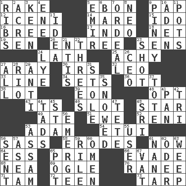 ACROSS 1. Libertine 5. Inky black, to poets 9. Infant food 12. Ancient Celtic tribe of eastern Britain 14. Female horse 15. Wedding promise 16. A special lineage 17. _ china 18. Fish or hair follower 19. Elected rep. 20. Main course 23. Elected reps. 24. Thin strip of wood or metal 25. Painful 27. Like ___ of sunshine 30. Big collection agency 32. Lion 33. Actor's bit 34. Arranges properly for use 36. Baseball player Mel 38. Car dealer's back yard 39. Period of immesurable duration 40. Elect 43. ___ a Wonderful Life 46. Position in a hierarchy or organization 48. Play the lead 49. Had dinner 51. She-sheep 52. Painter Guido (1575-1642) 53. First of billions? 54. Needle case 56. Backtalk 58. Eats (away) 61. Immediately 64. Curvy letter 65. Demure 66. Elude 68. Teachers' org. 69. Stare 70. The wife of a rajah (variant) 71. Scottish cap 72. Adolescent 73. Canvas cover DOWN 1. Chest bones 2. Measure of real estate 3. Peachy ____! 4. Compass dir. 5. Arab leader 6. Object of repulsion 7. Severe or trying experience 8. Modern: prefix 9. Abounding in pines 10. An important port of Yemen 11. Cooking vessels 13. The main thing one is thinking about 21. Nuclear Threat Initiatives 22. Trios 23. Attempt 24. Sodium hydroxide 26. Corporate head (abbr.) 27. 100% 28. River (Sp.) 29. Against 31. Took without asking 35. Frozen precipiation fell 37. Carry 41. Baking dish 42. Three (prefix) 44. Small boys 45. R.R. building 47. Wig 48. _ Lanka 50. Develop 53. Indian state 55. One who uses or employs something 56. Emitted 57. At sea 59. Cause heat under the collar 60. Presage 61. Grandmother 62. River in Europe 63. Shed a tear 65. Cooking vessel 67. Large container
