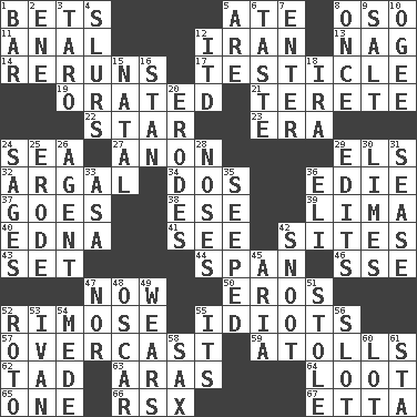 ACROSS 1. Wagers 5. Had dinner 8. Bear (Spanish) 11. Of or related to the anus 12. SW Asia republic 13. Tired old horse 14. Summer TV shows 17. A testis 19. Declaimed 21. Cigar-shaped 22. Play the lead 23. Epoch 24. Ocean 27. At once, immediately (arch.) 29. Raised railways 32. Therefore, facetiously 34. Two (Sp.) 36. Singer Brickell 37. Leaves 38. Compass dir. 39. Pale green bean 40. Pulitzer Prize-winning author Ferber 41. Observe 42. Locates 43. Arrange properly for use 44. Connect, as a bridge 46. Compass dir. 47. Immediately 50. Greek god of love 52. Full of chinks, cracks, or crevices 55. Foolish or stupid persons 57. Cloudy 59. Ringlike coral islands and reefs 62. Small boy 63. Caspian sea tributary 64. Spoils 65. Single 66. Acura sports coupe 67. Singer James DOWN 1. Drinking establishment 2. Compass dir. 3. Edible starchy tuberous root 4. Plays smoothly or legato 5. "We ___ not amused" (Victoria) 6. Clothes sense 7. Keyboard key 8. At one time in the past 9. Table seasoning 10. Double curve, resembling the letter S 12. It would 15. Brizilian seaport 16. Comedian Laurel of Laurel & Hardy 18. Lyricist Gershwin 20. Eats (away) 24. Gurus 25. Eat (away) 26. Rep 28. Olfactory organs 29. Proofreads 30. Citrus fruits 31. Gospel singer Marvin 33. White ___ sheet 35. Oozed 36. Biblical high priest 42. Snout, nose 45. Operatic vocal solo 47. Not either 48. Motion picture award 49. Erodes 51. Took without asking 52. Printing process, for short 53. _ the terrible 54. Ancient Persian 55. It is 56. Notch 58. Saxophone 60. Car dealer's back yard 61. R.R. building