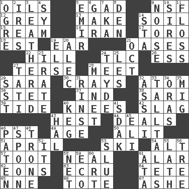 ACROSS 1. Lubricates 5. Mild oath 9. Overdraft (abbr.) 12. Jennifer or Joel 13. Create 14. The visible part of the earth's surface 15. 480, 500 or 516 sheets of paper 16. SW Asia republic 17. "Corrida" creature 18. Eastern Standard Time (abbr.) 19. Ewer handle 21. Fertile tracts in a desert 22. Land elevation 24. Affectionate concern, for short 26. Curvy letter 27. Laconic 28. Confront 29. "Two Mules for Sister ____" 30. Trading vessels 32. Tiny particle 36. Proofreading order 37. Indiana (abbr.) 38. Indian skirt 39. Periodic rise and fall of the sea level 40. Leg joints 42. Volcanic refuse 43. Command 44. Allots cards 46. Pacific Standard Time (abbr.) 49. Ripen 50. Came down and settled, as after flight 51. Showery time 53. What Jean-Claude Killy likes to do 54. Keyboard modifier key 57. A blast of a horn 58. Actress Patricia 61. Having or resembling wings 62. Immeasurably long periods of time 63. Shade of tan 64. Wig 65. Compass dir. 66. Lug 67. American tennis player Robert DOWN 1. Legendary monster 2. Angers 3. Tough but pliablecoriaceous 4. Symbol (abbr.) 5. Independent ruler or chieftain 6. Slender fish 7. Alias (abbr.) 8. Lair 9. Trap for birds or small mammals 10. Founders of families 11. Soft thread for cleaning between teeth 14. R.R. building 19. Raised railways 20. Actor Baldwin 21. Sep. follower 23. Feeling or showing extreme anger 24. Miss Universe 1986, Barbara Palacios _ 25. French article 27. Jacques of French films 28. French painter Edouard 29. Fast jet (abbr.) 31. Remove soap 32. Slender Brazilian palm 33. Baron Munchausen's specialties 34. Mouths or openings 35. Russian fighter aircraft 40. Barrel 41. Neighbor of Neb. 43. Actor Linden 45. Biblical high priest 46. Eucharist need 47. Soup utensil 48. Heavy duty weighing machine 52. ___ a Wonderful Life 53. Change direction abruptly 55. Thin strip of wood or metal 56. Relationship diagram 58. Fish or hair follower 59. Environmental prefix 60. Tate display 61. _ moment's notice (2 wds.)