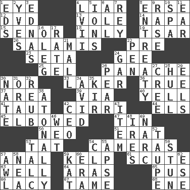 ACROSS 1. Sight organ 4. One who doesn't tell the truth 8. Celtic language 12. Movie disc 13. Short-tailed, large-bodied rat 14. California wine valley 15. Sir (Sp.) 18. Inwardly 19. Russian ruler of old 20. Deli grouping 22. Before (prefix) 23. Bristle 24. Turn to the right 25. Set 26. Flamboyance 30. Or not 33. Member of a famous L.A. basketball team 36. Loyal 37. Type of rug 39. By way of 40. Shout 41. Strained 42. High-altitude cloud 44. Raised railways 45. Shoved, as through a crowd 47. Shallow baking pan 50. Modern: prefix 51. Part of Q.E.F. 53. Make lace 54. Devices for capturing images 57. Of or related to the anus 59. Seaweed 61. Turtle shell scale 63. Not ill 64. Caspian sea tributary 65. Tenth month of the Hindu calendar 66. Made of lace 67. Docile 68. Compass dir. DOWN 1. Begley and Asner 2. Jacques Cousteau's middle name 3. Ferber et al. 4. 57 in ancient Rome 5. Charged atoms 6. Everything 7. Marina Del _, California 8. Plea 9. To erase 10. Health resort 11. Hearing organ 16. Cassini of fashion 17. Pace 21. Promenade 22. Animal enclosure 24. Slender fish 26. Lightbulb-shaped fruit 27. Algonquian 28. Frame or body of a ship 29. Snakelike fish 30. Nathan's nickname 31. Spoken 32. Reuben's nickname 34. Enthusiastic 35. Apertif with cassis 38. Without tonality 42. Corporate head (abbr.) 43. A whole individual unit 46. Soggy 48. Angers 49. Drug cop 52. Grayish beige 53. Baby powder 54. Burrowing marine mollusk 55. Domed church section 56. Surprise greatly 57. Leather borer 58. Teachers' org. 59. Krazy ___ of comics 60. Epoch 62. Compass dir.