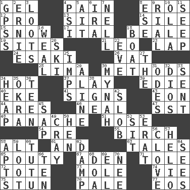 ACROSS 1. Set 4. Ache 8. Greek god of love 12. Adept person 13. Male parent of an animal 14. Drop; flow; fall 15. Overwhelm 17. Slanted text style (abbr.) 18. Calif. Air Force Base 19. Locates 21. Lion 23. Pet locale 24. 1973 Nobel Price Winner (Physics) Leo 26. Large container 28. Pale green bean 30. Modes 34. Being at a high temperature 37. Romp 39. Singer Brickell 40. Make supply last 41. Signals 43. Age 44. Ancient Greek god of war 46. Be tempered by heat 47. Fast jet (abbr.) 48. Flamboyance 51. Stockings 54. Before (prefix) 55. A tree used for making furniture 58. Keyboard modifier key 61. Also 63. Stories 65. Inclined to pout 67. An important port of Yemen 71. Lacquered or enameled metalware 72. Lug 73. Undercover agent 74. Compete 75. Surprise greatly 76. Diluted with white 77. Greek goddess of the dawn DOWN 1. Global Positioning Systems (abbr.) 2. Bert's buddy 3. Plunders 4. 23rd letter of the Greek alphabet 5. Small island 6. Lyricist Gershwin 7. 1994 drama film starring Jodie Foster 8. Compass dir. 9. Monetary unit of Yemen 10. Spanish pot 11. Ooze 16. Welt 18. Water vessel 20. What Jean-Claude Killy likes to do 22. First lady 25. Naughty children 27. Definite Article 29. Place in a line 30. Non-adult bird? 31. Lyric poems 32. "Vaya con ____" 33. Transmitted 34. Pile 35. Gumbo ingredient 36. Adolescent 38. Mature 42. Messy guy 45. Plant excrement 49. Supercomputer manufacturer 50. Layer 52. Be seated 53. Part of Q.E.F. 56. Garlic unit 57. Sun: prefix 58. Tenement units (abbr.) 59. Plunder 60. Ballerina skirt 62. Moist 64. Observes 66. Nine, plus one 68. ___ good deed 69. Pipe bend 70. Born