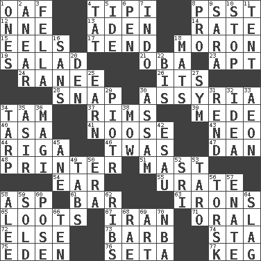 ACROSS 1. Clumsy lout 4. Native american tent (variation) 8. Inconspicuous attention getter 12. Compass dir. 13. An important port of Yemen 14. Pace 15. Snakelike fish 17. Watch over 18. Person of subnormal intelligence 19. First course 21. Chief or king in Benin or Nigeria 23. Fitting 24. The wife of a rajah (variant) 26. It is 28. Fastener 30. Nineveh was its capital 34. Scottish cap 37. Basketball hoops 39. Ancient Persian 40. White ___ sheet 41. Trap for birds or small mammals 43. Modern: prefix 44. Capital of Latvia 46. It was, poetically 47. One of the 12 tribes of Israel 48. Hard copy producer 51. Vertical spar for supporting sails 54. Hearing organ 55. A salt of uric acid 58. Cleo's killer 61. Drinking establishment 63. Removes the wrinkles 65. Plunders 67. SW Asia republic 71. Taken by mouth 72. Otherwise 73. Sharp remark 74. R.R. building 75. Genesis locale 76. Bristle 77. Cask DOWN 1. Singles 2. Approach 3. Man or boy (slang) 4. Make lace 5. Binary compound 6. Fenced enclosure 7. Southeast Asian peninsula 8. Adept person 9. "Two Mules for Sister ____" 10. Obstruct or block passage 11. Portable shelter 16. Without 18. Floor protectors 20. Lair 22. Again 25. Merit 27. Symbol (abbr.) 29. Peter (Polish) 30. Indian state 31. Tear apart 32. The main thing one is thinking about 33. Age 34. Canvas cover 35. SW Saudi Arabia district 36. Wise men 38. Cut the grass 42. Son of Isaac 45. A saturated hydrocarbon 49. Bar bills 50. Epoch 52. Indian title of respect (Mr.) 53. Pacific island yam 56. Cod relative 57. Maternal 58. Toward shelter 59. Disposed of to a purchaser 60. Introduce or present, as a question 62. Chest bones 64. Volcanic refuse 66. Nine, plus one 68. Actress Charlotte 69. Tate display 70. Basketball assoc.