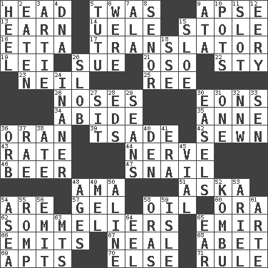 ACROSS 1. Froth on beer 5. It was, poetically 9. Domed church section 13. Merit 14. Ubangi River tributary 15. Took without asking 16. Singer James 17. Interpreter 19. Flowery wreath 20. Take to court 21. Bear (Spanish) 22. Filthy place 23. Famous astronaut Armstrong 25. Portuguese money of account (variant) 26. Olfactory organs 30. Immeasurably long periods of time 34. Remain 35. Singer Murray 36. Northwest Algerian city 39. Sadhe (variant) 42. Stitched 43. Pace 44. Effrontery 46. Fermented drink made from hops 47. Slow-paced one 48. Wet nurse (var.) 51. "____ silly question..." 54. "We ___ not amused" (Victoria) 57. Set 58. Lubricate 60. Mouth or opening 62. Wine waiters 65. Independent ruler or chieftain 66. Sends forth 67. Anneal 68. Collude with 69. Flats, for short 70. Otherwise 71. General guideline DOWN 1. The bottom of a shoe or boot 2. Consumed 3. Nick name for Arthur 4. Heredity factor (abbr.) 5. Ballerina skirt 6. We are 7. Wing 8. Sir (Sp.) 9. "One Day ___ Time" 10. Cooking vessels 11. Narrow opening 12. Suggestive of the supernatural 15. A type of plum 18. Compass dir. 20. Oscar Madison type 24. More empty; more void 27. Be seated 28. Begley and Asner 29. Seines 30. Artist's stands 31. Single 32. Compass dir. 33. Elected rep. 36. Globe 37. Actress Charlotte 38. Had dinner 40. Lair 41. Epoch 45. Small bottle 48. Grows older 49. Cartoonist voice _ Blanc 50. Place in a line 52. Dried seaweed eaten as food 53. Satellite of Uranus 54. Toward the sea 55. Frolic 56. Send forth 58. Mouths or openings 59. Small island 61. Johnson of "Laugh-In" 63. Mountains (abbr.) 64. Snakelike fish 65. Ewer handle