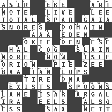ACROSS 1. SW Saudi Arabia district 5. Make supply last 8. Nonscientific branch of learning 11. Make mention of 12. Moving, as bait 14. Area sheltered from the wind 15. "_____ Recall" 17. Practice fight 18. Greek goddess of the earth (variant) 19. Sounds asleep 21. Realm 23. American Automobile Association (abbr.) 25. Locale of original sin 26. Migrant worker of the '30s 27. Lair 28. Compass dir. 31. Actor Linden 33. Gear tooth 35. Killed 37. Greater amount 38. Immediately 40. Small island 41. Greek mythologigal hunter 43. Sliced dessert 45. Last letter of the English alphabet 46. Sound made by sheep 47. Scottish cap 50. Chops off 52. Become fatigued 53. Heredity factor (abbr.) 54. Is 56. Soup utensils 61. Unable to walk 62. Austrian river, tributary to the Danube 65. Therefore, facetiously 66. Lyricist Gershwin 67. Snakelike fish 68. In addition 69. Curvy letter 70. Saxophone 71. Remaining after all deductions DOWN 1. Pismires 2. Within a short period 3. "Tell ____ the Marines!" 4. Buttocks 5. Raised railways 6. Monetary unit of Laos 7. Eluded 8. Jai _ 9. It's straight from the horse's mouth 10. Afternoon social gathering 13. Wear away 16. Path through which fluid escapes 18. Separate the seeds from cotton 20. Ketch in the Levant 22. Not women's 24. Period of immesurable duration 26. Butter sub 28. Relaxation 29. Filth; sediment 30. Compass dir. 31. Israeli folk dance 32. Roberta Peters solo 34. Republican Party 36. Belonging to Elizabeth 37. Disorderly crowd 39. Uncontrolled 42. Nuclear Threat Initiatives 44. Immeasurably long periods of time 48. Nick name for Arthur 49. Makes clutter 51. Dad 52. Standoff 54. Hearing organs 55. Dec. holiday 57. NW Algerian seaport 58. Stare at amorously 59. Political cartoonist Thomas 60. Groove 61. Falsehood 63. In the manner of 64. Acura sports coupe