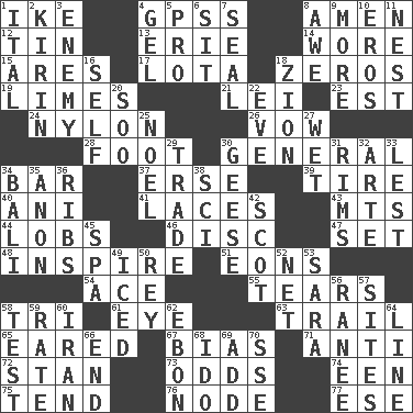 ACROSS 1. D.D.E's nickname 4. Global Positioning Systems (abbr.) 8. So be it 12. Metal container 13. 4th largest of the Great Lakes 14. Had on 15. Ancient Greek god of war 17. Globular water bottle used in Asia 18. Nothings 19. Citrus fruits 21. Flowery wreath 23. Eastern Standard Time (abbr.) 24. Thermoplastic polyamide 26. Promise 28. Pick up the tab 30. Commissioned military rank 34. Soap unit 37. Celtic language 39. Become fatigued 40. Cuckoo 41. Shoestrings 43. Mountains (abbr.) 44. Tennis shots 46. Compact _ 47. Arrange properly for use 48. Stimulate to action 51. Immeasurably long periods of time 54. Adept person 55. Lacerates 58. Three (prefix) 61. Sight organ 63. Get behind 65. Having ears or earlike features 67. Prejudice 71. Against 72. Comedian Laurel of Laurel & Hardy 73. Probability 74. Car or cant ending 75. Look after 76. Connecting point 77. Compass dir. DOWN 1. Slanted text style (abbr.) 2. Japanese brewing company 3. Foe 4. Set 5. Adept person 6. Be seated 7. Lick closed 8. Deep reverence 9. Greater amount 10. Greek god of love 11. A home for chicks 16. Itself 18. The Jewish people; Israel 20. "Barney Miller" actor Jack 22. Night before a holiday 25. Christmas carol 27. Dripping 29. Barter 30. Honkers 31. Basketball hoops 32. Johnson of "Laugh-In" 33. For fear that 34. Indonesian resort city 35. At once, immediately (arch.) 36. Teases 38. _-fi 42. Highlander 45. Health resort 49. On the rocks 50. Marina Del _, California 52. Fish or hair follower 53. "Two Mules for Sister ____" 56. Indian princess (variant) 57. Locates 58. Trial 59. Assign a rank or rating to 60. SW Asia republic 62. Inky black, to poets 64. Actor's bit 66. Conclusion 68. Wedding promise 69. Increase 70. Compass dir.