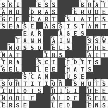 ACROSS 1. What Jean-Claude Killy likes to do 4. Double-curved letter 7. Naughty child 11. Added to 12. Mouths or openings 13. Wear away 14. Unit of force equal to gravity 15. Draw slowly or heavily 16. Chalkboards 17. Gospel singer Marvin 19. Aide 21. Hearing organ 23. Eras 24. Hyperbolic tangent 25. The 18th letter of the Arabic alphabet 26. Compass dir. 29. With motion or animation 30. Raised railways 31. Before (prefix) 32. Floor protector 33. Big collection agency 34. Small island 35. Lyricist Gershwin 36. _-fi 37. Proofreads 40. Set 41. Area sheltered from the wind 42. Floor protectors 43. Skim 45. Purpose 46. Conclusion 51. Obscenities 55. Foolish or stupid persons 56. Swiss mountan, "Queen of the Mountains" 58. To sift 59. Impressive in appearance 60. Medicinal plant 61. Commissioned mil. rank 62. Celtic language 63. Lion 64. Followers of ems DOWN 1. Sinks 2. Leg joint 3. The main thing one is thinking about 4. Period 5. "Two Mules for Sister ____" 6. Fast planes 7. Naughty children 8. Round or rotation of duties 9. Arabian gulf 10. Trial 12. Seas 13. Otherwise 16. Signals 18. Oceans 20. Moves on water 22. 17th letter of the Greek alphabet 24. "_____ Recall" 25. Nest on high 26. Arguments over trivial matters 27. Indian titles of respect 28. Soggy 29. Female horse 32. Russian fighter aircraft 33. Ancient Celtic tribe of eastern Britain 36. Narrow boards 37. Australian flightless bird 38. Hyrax 39. Detail 43. Fur scarf 44. Quote 46. Trig term 47. Scent 48. Teases 49. Relating to the mouth 50. "Death on the ____" 52. Goad 53. Adolescent 54. Elected reps. 57. Thick or sticky substance