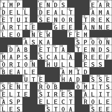 ACROSS 1. Naughty child 4. Conclusions 8. Ewer handle 11. Small valley 13. Started a card game 15. Wet nurse (var.) 16. Needle case 17. Sir (Sp.) 18. Long journey 19. Nick name for Arthur 21. Unit of force equal to gravity 22. Singer Murray 23. Lion 24. ___ Haven, CT 27. Opposite of masc. 29. "____ silly question..." 30. Soup utensil 34. Small moist lump or mass 36. Singer James 39. Is inclined (to) 40. Atlas contents 41. Any of the three canals of the cochlea 43. Coral ridge 44. Constellation of myth 46. Frame or body of a ship 47. Double-curved letter 48. Memphis, Tenn. Street 49. Among 51. Shoshoni 53. Possessed 54. Compass dir. 57. Transmitted 60. Director Reiner 63. Leaves out 65. Writer Wiesel 66. Titles for men of rank and authority 69. Came down and settled, as after flight 70. Cleo's killer 71. Voters do this 72. Hero or heavy, e.g. 73. French article 74. Portico 75. Perceive with the eye DOWN 1. Perfect 2. Distance measurement (Brit.) 3. Greek god of the underworld 4. Begley and Asner 5. Born 6. Mild oath, euphamism for damn 7. A type of plum 8. Merit 9. So be it 10. Libertine 12. Cards in a Roman deck? 14. Unclean, religiously 18. ________ with (broke a safety seal) 20. Followers of ems 25. Supplements with great effort 26. Observe 28. Eastern Standard Time (abbr.) 29. Utter; complete 31. Washington bills 32. Lyric poems 33. Science/research agcy. 34. Have the gumption 35. Capital of Western Samoa 37. The 19th letter of the Greek alphabet 38. Assad's deity 40. Disorderly crowd 42. _ mater 45. Fish or hair follower 50. Wedding promise 52. Celtic language 54. Grain storage towers 55. Vertical member of a panel or frame 56. First name in cosmetics 57. Lick closed 58. Otherwise 59. Pinches, bites 61. Lubricates 62. Cy Young winner Saberhagen 64. Impair 67. Environmental prefix 68. R.R. building