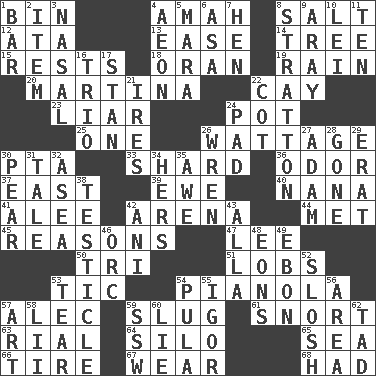ACROSS 1. Storage container 4. Wet nurse 8. Table seasoning 12. _ moment's notice (2 wds.) 13. Relaxation 14. Woody plant 15. Musical pauses 18. NW Algerian seaport 19. Precipitation 20. Chrissie's court nemesis 22. Island 23. One who doesn't tell the truth 24. Plant holder 25. Single 26. Electrical Measurement 30. Parent Teacher Assoc. 33. Pottery fragment 36. Scent 37. 90 degrees 39. She-sheep 40. Grandmother 41. Toward shelter 42. Sports stadium 44. Was introduced to 45. Thinks logically 47. Area sheltered from the wind 50. Three (prefix) 51. Tennis shots 53. Nervous spasm 54. Player piano 57. Actor Baldwin 59. Snaillike creature with no shell 61. Derisive sound 63. Monetary unit of Yemen 64. Grain storage tower 65. Ocean 66. Hoop that covers a wheel 67. Put on (as clothing) 68. Possessed DOWN 1. Long, evenly shaped piece 2. A distinct part 3. Rhinal 4. A really long time 5. Hindu Mythology: god of death 6. White ___ sheet 7. Layer 8. Ski resort town in Vermont 9. Like ___ of sunshine 10. Flowery wreath 11. "___ Little Indians" 16. Musical group of three 17. Comedian Laurel of Laurel & Hardy 21. Angers 22. Small bed 24. Groovy apt. 26. Songbird 27. First of billions? 28. Went 29. Part of Q.E.F. 30. Lightbulb-shaped fruit 31. Falsehood 32. At sea 34. Possessive pronoun 35. Deep reverence 38. A testis 42. Black tropical American cuckoo 43. Silent film actress Nazimova 46. The grampus (Milton) 48. Immeasurably long periods of time 49. Inky black, to poets 52. Splash clumsily 53. Separate forcefully 54. Monetary unit of Botswana 55. Russian composer Stravinsky 56. Type of rug 57. Nonscientific branch of learning 58. Cards in a Roman deck? 59. Compass dir. 60. Whopper 62. Small amount or degree
