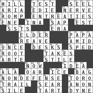 ACROSS 1. Place where flour is made 5. Trial 9. Stitch closed the eyes of (a falcon) 13. Roberta Peters solo 14. Singer Brickell 15. Impudent aggressiveness 16. Play 17. Pleas 19. Compass dir. 20. _ tizzy (2 wds.) 21. Plant excrement 22. Eastern Standard Time (abbr.) 23. Fast planes 25. Epoch 26. A person who is older than you are 30. Dad 34. Rob, plunder, or pillage 35. Among 36. At one time in the past 39. Writing tables 42. Drove too fast 43. Carrot, for example 44. Proceeds 46. Johnson of "Laugh-In" 47. Vertical member of a panel or frame 48. At this time 51. The content of cognition 54. Chicken ___ king 57. Rowing implement 58. Frozen water 60. Paper or plastic container 62. Unrelated to defense, as in spending 65. "Corrida" creature 66. Get behind 67. Wither 68. Soon (poet.) 69. Drop; flow; fall 70. Small pie 71. Centimeter-gram-second unit of force DOWN 1. Female horse 2. Removes the wrinkles 3. Citrus fruits 4. Infant locale 5. Adolescent 6. Pulitzer Prize-winning author Ferber 7. Be seated 8. Laconic 9. Put into a specified state 10. One of the Great Lakes 11. Nights before holidays 12. For fear that 15. California wine valley 18. Ewer handle 20. Small island 24. Cylindrical with tapered ends 27. Male parent 28. Night before a holiday 29. Musical pauses 30. Went by 31. Electrical Unit 32. Sliced dessert 33. Increase 36. Mouth or opening 37. Or not 38. Small bed 40. Krazy ___ of comics 41. What Jean-Claude Killy likes to do 45. Writer Wiesel 48. Christmas carol 49. Clumsy lout 50. Obtain by seizing forcibly or violently 52. Dark wood 53. Composer Copland 54. Pismires 55. Australian parrot (variant) 56. Of or related to the anus 58. Austrian river, tributary to the Danube 59. An absolute certainty 61. Went 63. Pass on 64. Teachers' org. 65. Bit