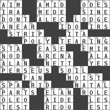 ACROSS 1. Direct toward a target or goal 4. Among 8. Lyric poems 12. Lyricist Gershwin 13. Ancient Persian 14. Trig term 15. Do not 17. Actor Baldwin 18. Inn 19. Approach 21. Wedding promise 23. Big collection agency 24. Remove all contents or possession from 26. Call ___ day 28. Much (prefix) 30. Lacerating 34. R.R. building 37. Relaxation 39. Arab leader 40. Allow head to fall sleepily 41. Sports stadium 43. In the manner of 44. ____ Jay Lerner 46. Remaining after all deductions 47. Affirmative reply 48. Son of Zeus who helped slay Medusa 51. The visible part of the earth's surface 54. Avid follower 55. Wet 58. Health resort 61. To free from 63. Brizilian seaport 65. Pieces 67. Style 71. Hero or heavy, e.g. 72. Butter sub 73. Helper 74. French article 75. Trial 76. Do over again 77. Eastern Standard Time (abbr.) DOWN 1. Opera by Verdi 2. Removes the wrinkles 3. French painter Edouard 4. Housemaid (var.) 5. Cartoonist voice _ Blanc 6. Binary compound 7. Tenth: prefix 8. Bear (Spanish) 9. "You Light Up My Life" star Conn 10. Engineer (abbr.) 11. Observes 16. Canvas cover 18. Globular water bottle used in Asia 20. River (Sp.) 22. Pass on 25. Entreaty 27. "We ___ not amused" (Victoria) 29. Entertaining tales 30. Portable shelters 31. "If ____ say so..." 32. "Death on the ____" 33. Pate de foie ____ 34. Fastener 35. Lacquered or enameled metalware 36. The sixth month of the Jewish calendar 38. Perceive with the eye 42. Tiny particle 45. Overdraft (abbr.) 49. Hearing organs 50. University (slang) 52. Electrically charged atom 53. One who doesn't tell the truth 56. Fur scarf 57. Falsehoods 58. Blemish 59. Light colored 60. Ancient Greek god of war 62. Letter starter 64. For fear that 66. Small child 68. Untruth 69. Say or write further 70. Modern: prefix