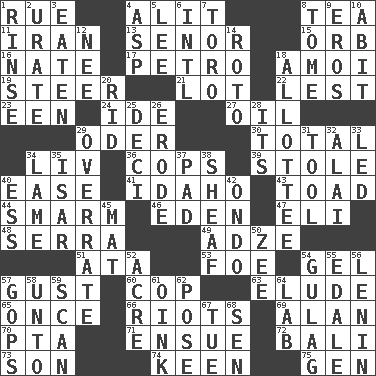 ACROSS 1. Sorrow 4. Came down and settled, as after flight 8. Afternoon social gathering 11. SW Asia republic 13. Sir (Sp.) 15. Globe 16. Nathan's nickname 17. Stone: prefix 18. Mine, in Marseilles 19. Guide 21. Car dealer's back yard 22. For fear that 23. Car or cant ending 24. Binary compound 27. Petroleum 29. River in Europe 30. "_____ Recall" 34. 54 in ancient Rome 36. 911 reaches them 39. Fur scarf 40. Relaxation 41. Potato state 43. Frog relative 44. Excessive but superficial compliments 46. Locale of original sin 47. Biblical high priest 48. Father Junipero _ 49. Edge tool used to cut and shape wood 51. _ moment's notice (2 wds.) 53. Enemy 54. Set 57. Abrupt rush of wind 60. Police officer (slang) 63. Evade 65. Single time 66. Debaucheries 69. Actor Alda or Thicke 70. Parent Teacher Assoc. 71. Follow as a consequence or result 72. Indonesian resort city 73. Manchild 74. Peachy ____! 75. Commissioned mil. rank DOWN 1. Remove soap 2. A salt of uric acid 3. Consumed 4. Viper 5. Area sheltered from the wind 6. International (abbr.) 7. "Corrida" creature 8. Heavy book 9. Greek god of love 10. "This won't hurt ____!" 12. Born 14. Printing process, for short 18. One to whom something is allotted 20. To free from 25. Tenth: prefix 26. Eat (away) 28. It is 29. Make much ado about nothing 31. Instrument 32. Mountain range southwest of Kyrgyzstan 33. Directed 34. Unable to walk 35. Austrian river, tributary to the Danube 37. Writing tablet 38. Bundle of cut stalks of grain 40. Curvy letter 42. Southwest Nigerian state 45. Floor covering 50. Last letter of the English alphabet 52. 1/640 square mile 54. POW camp 55. Peak District village in England 56. Soviet premier 1918-24 57. Republicans 58. To (old English) 59. Examine hastily 61. Pig sound 62. Airs 64. Experiment locale 67. Third day of the wk. 68. Elected rep.
