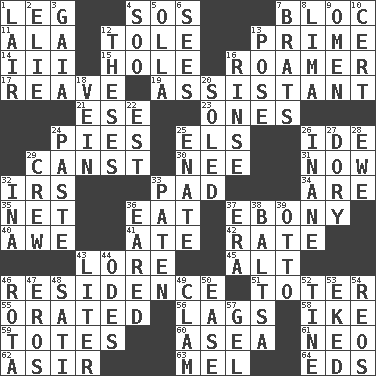 ACROSS 1. Part of a journey 4. Mayday 7. Group of countries in special alliance 11. In the manner of 12. Lacquered or enameled metalware 13. A-one 14. One more than two 15. Hollow 16. Wanderer 17. Break or tear apart 19. Helper 21. Compass dir. 23. Singles 24. Sliced desserts 25. Raised railways 26. Binary compound 29. 2nd pers. sing. pres. of can (arch.) 30. Born 31. Immediately 32. Big collection agency 33. Writing tablet 34. "We ___ not amused" (Victoria) 35. Fish or hair follower 36. Consume 37. Black 40. Deep reverence 41. Had dinner 42. Pace 43. Old wives' tales, e.g. 45. The first octave above the treble staff 46. Home 51. Carrier 55. Declaimed 56. Falls behind 58. Mamie's mate 59. Hauls 60. Toward the sea 61. Modern: prefix 62. SW Saudi Arabia district 63. Cartoonist voice _ Blanc 64. Begley and Asner DOWN 1. Den 2. Writer Wiesel 3. Greek goddess of the earth (variant) 4. "Barney Miller" actor Jack 5. Spanish pot 6. Perceives with the eye 7. Naughty children 8. Pale green bean 9. Presage 10. An absolute certainty 12. College papers 13. Introduce or present, as a question 16. Remove soap 18. Distinctive style or manner 20. Having a sole or soles 22. Eastern Standard Time (abbr.) 24. Thick mixture 25. Maternal 26. Silly 27. Rowboat 28. She-sheep 29. Ship's personnel 32. _ tizzy (2 wds.) 33. Eucharist need 36. Having ears or earlike features 37. Epoch 38. Greek mezzo-soprano Agnes 39. Von Bismarck 43. 61 cubic inches 44. Lyric poems 46. Roll call or roster of names 47. Greek god of love 48. Suttee (variant) 49. Dollar (slang) 50. Comfort 52. Prong on a fork 53. Supplemented with great effort 54. Vintage cars 57. Set